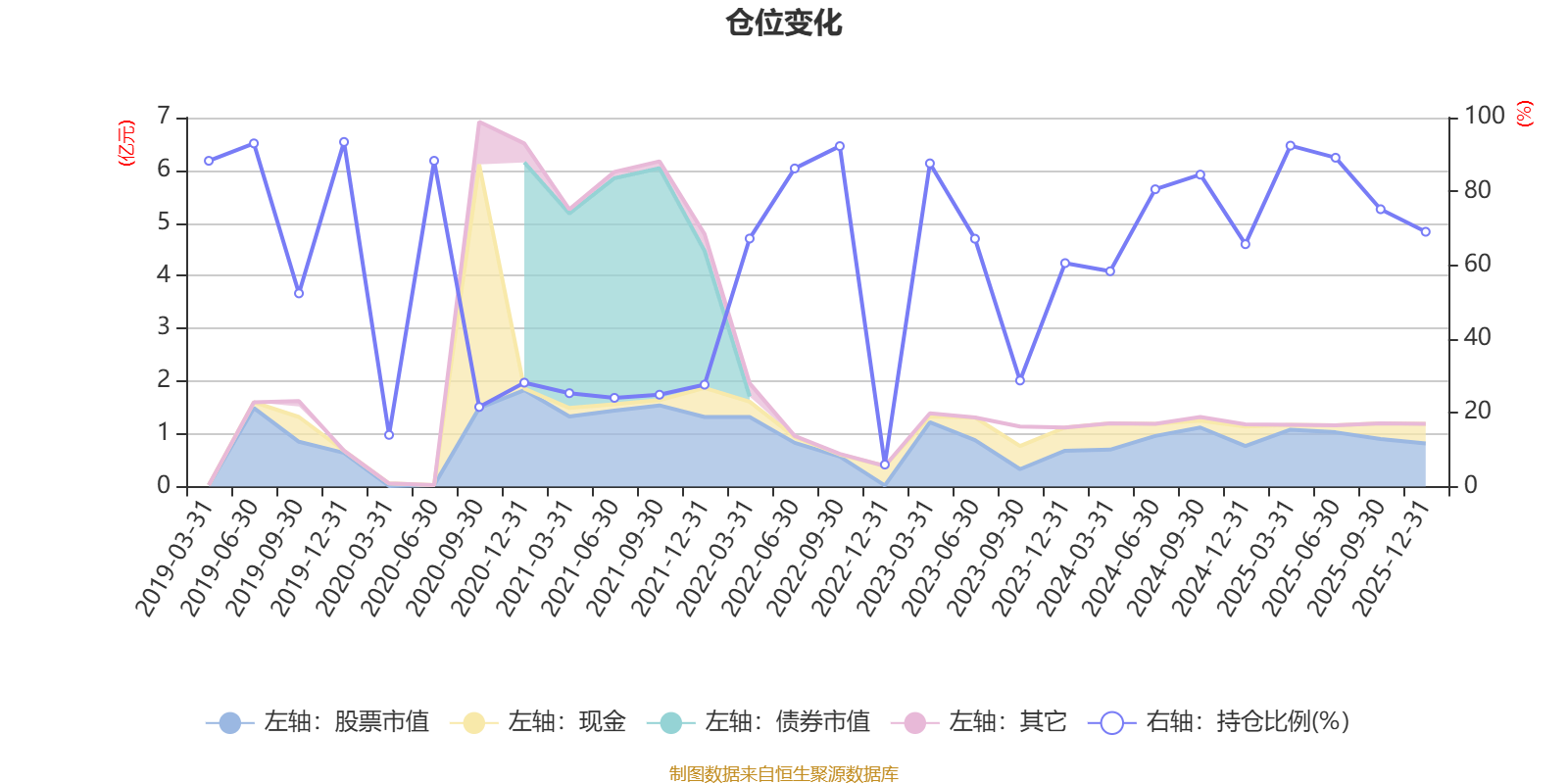 据定期报告数据统计,近三年平均股票仓位为71.58%,同类平均为72.57%。2019年末基金达到93.4%的最高仓位,2022年末最低,为5.96%。