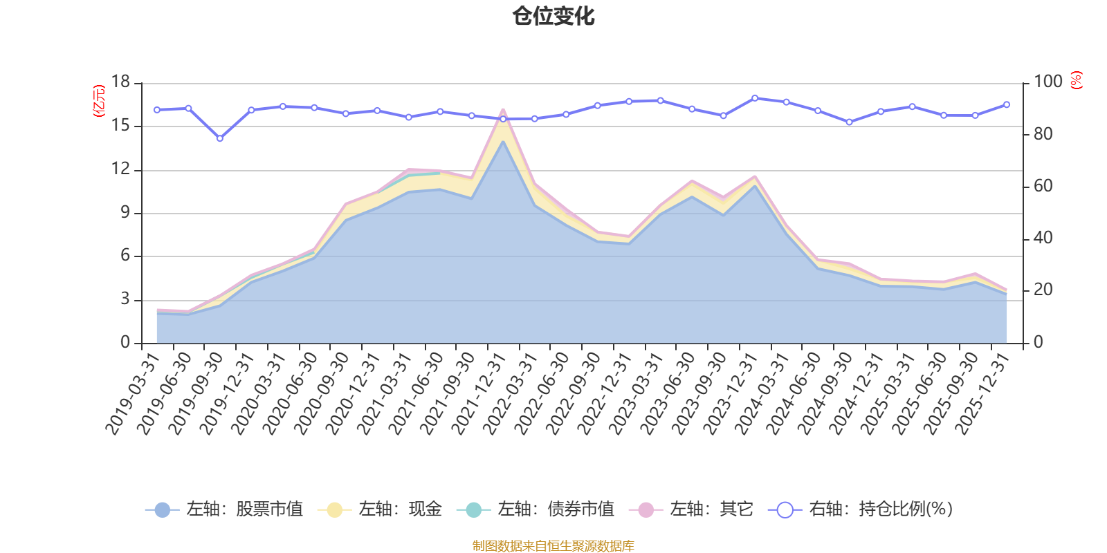 据定期报告数据统计,近三年平均股票仓位为89.88%,同类平均为85.83%。2023年末基金达到94.18%的最高仓位,2019年三季度末最低,为78.7%。