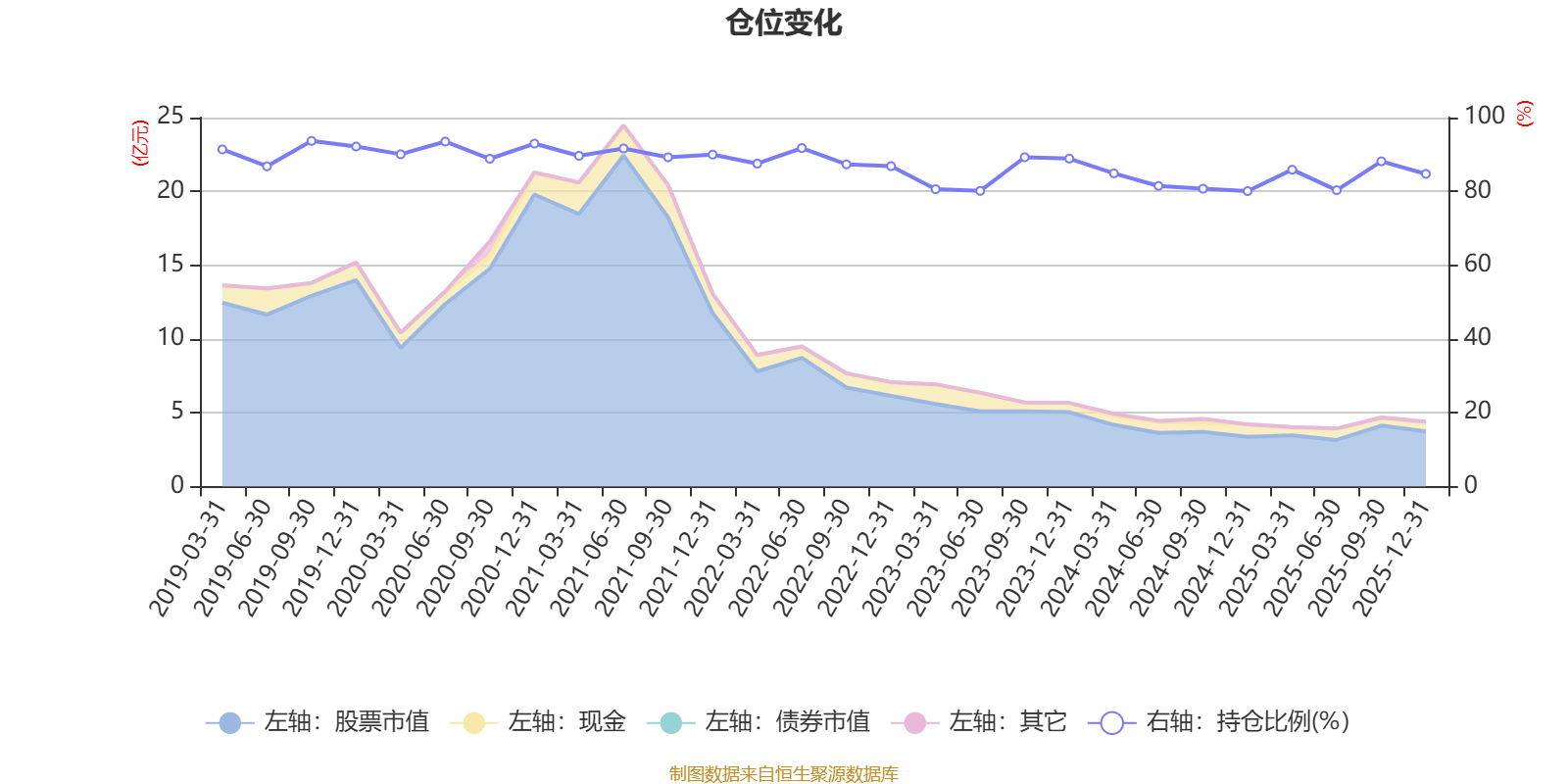 据定期报告数据统计,近三年平均股票仓位为83.76%,同类平均为88.27%。2019年三季度末基金达到93.68%的最高仓位,2024年末最低,为80.07%。