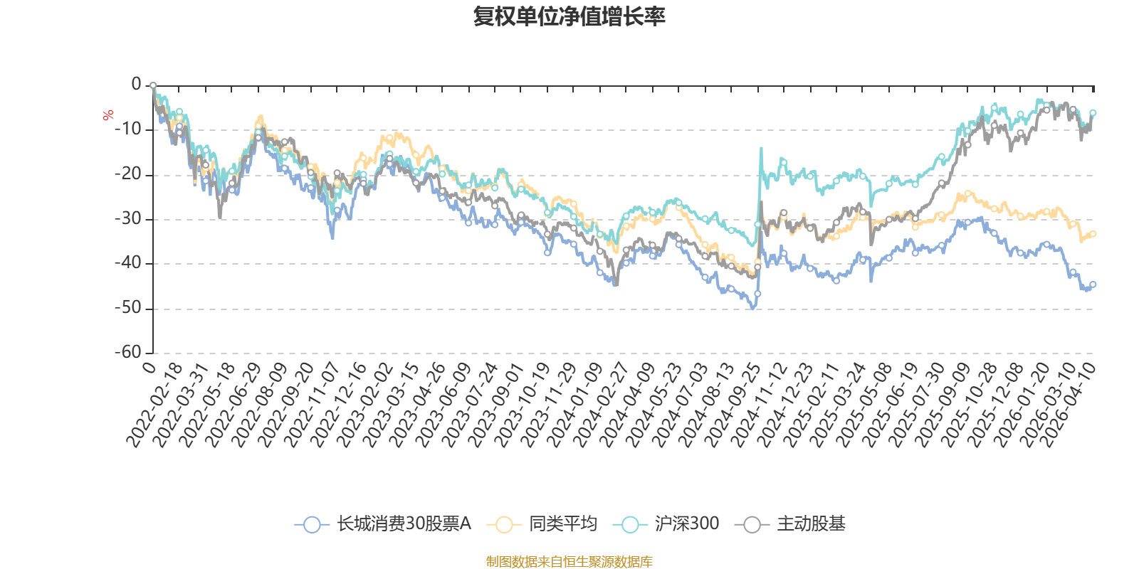 截至4月10日,长城消费30股票A近三个月复权单位净值增长率为-13.23%,位于同类可比基金42/43;近半年复权单位净值增长率为-19.52%,位于同类可比基金41/43;近一年复权单位净值增长率为-6.81%,位于同类可比基金23/43;近三年复权单位净值增长率为-29.32%,位于同类可比基金29/41。