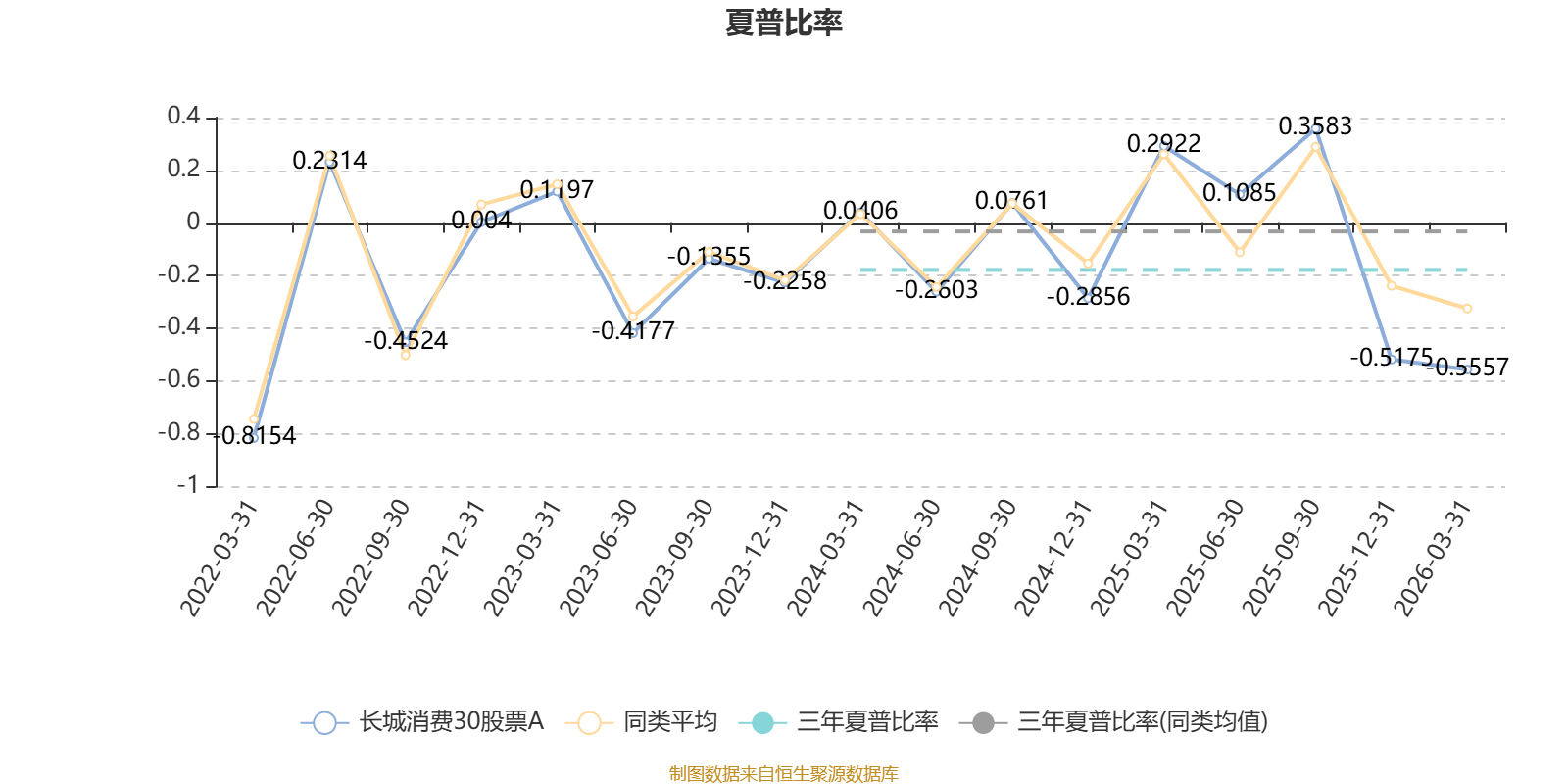 截至3月31日,基金近三年夏普比率为-0.1778,位于同类可比基金28/41。