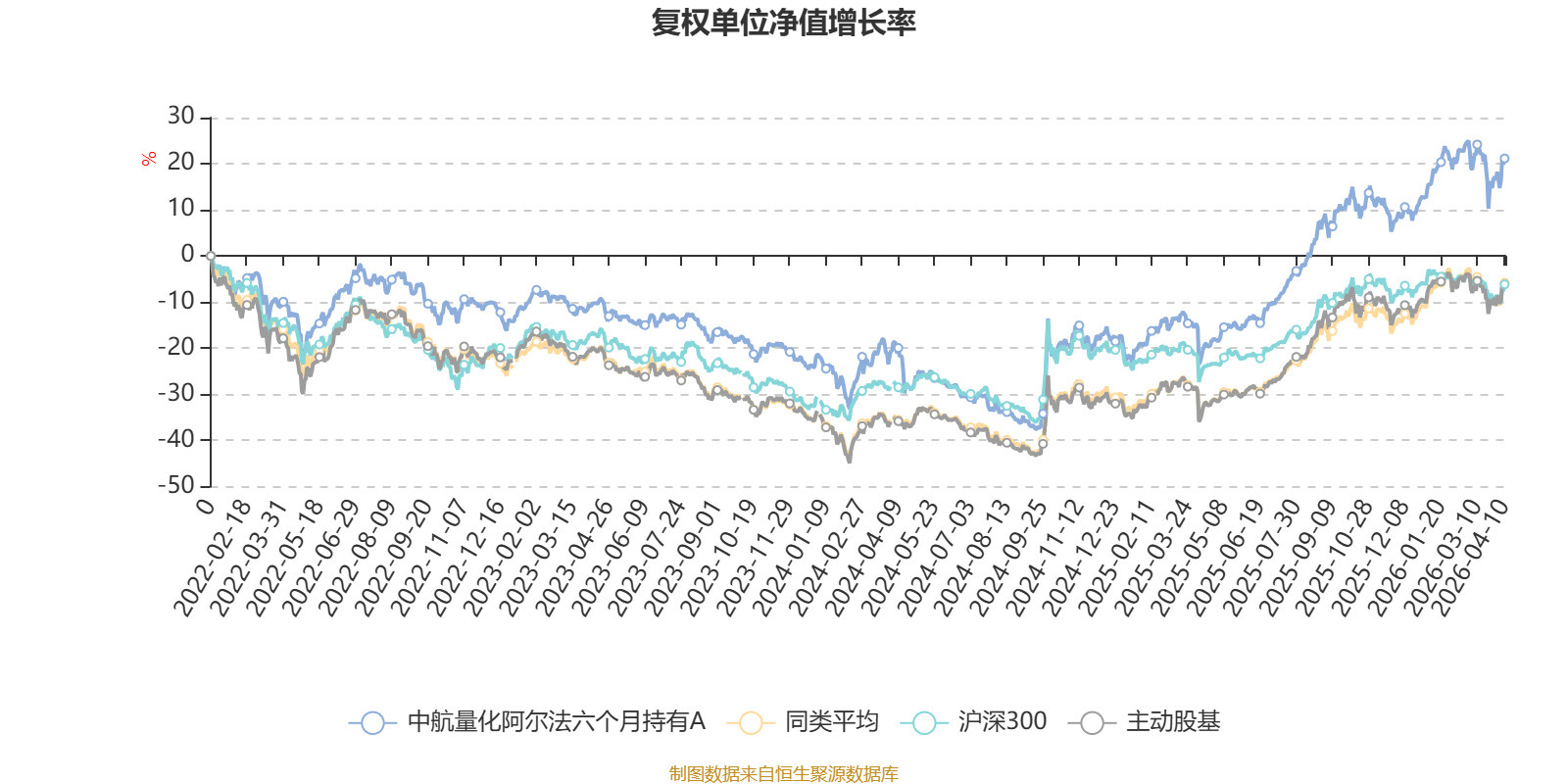 截至4月10日,中航量化阿尔法六个月持有A近三个月复权单位净值增长率为3.40%,位于同类可比基金34/121;近半年复权单位净值增长率为7.40%,位于同类可比基金61/121;近一年复权单位净值增长率为52.27%,位于同类可比基金37/120;近三年复权单位净值增长率为35.01%,位于同类可比基金20/90。