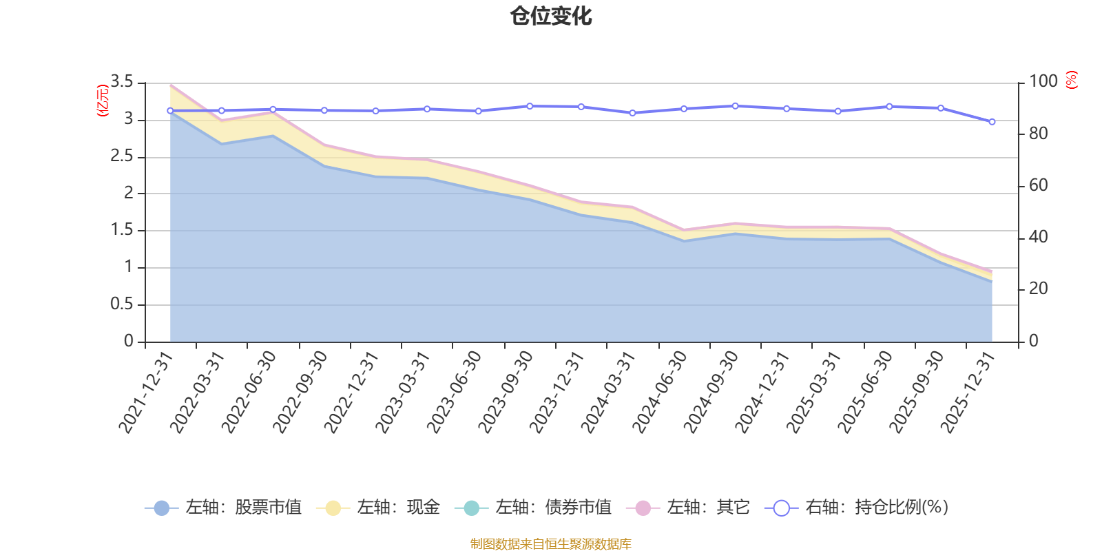 据定期报告数据统计,近三年平均股票仓位为89.55%,同类平均为88.34%。2024年三季度末基金达到91.02%的最高仓位,2025年末最低,为84.9%。