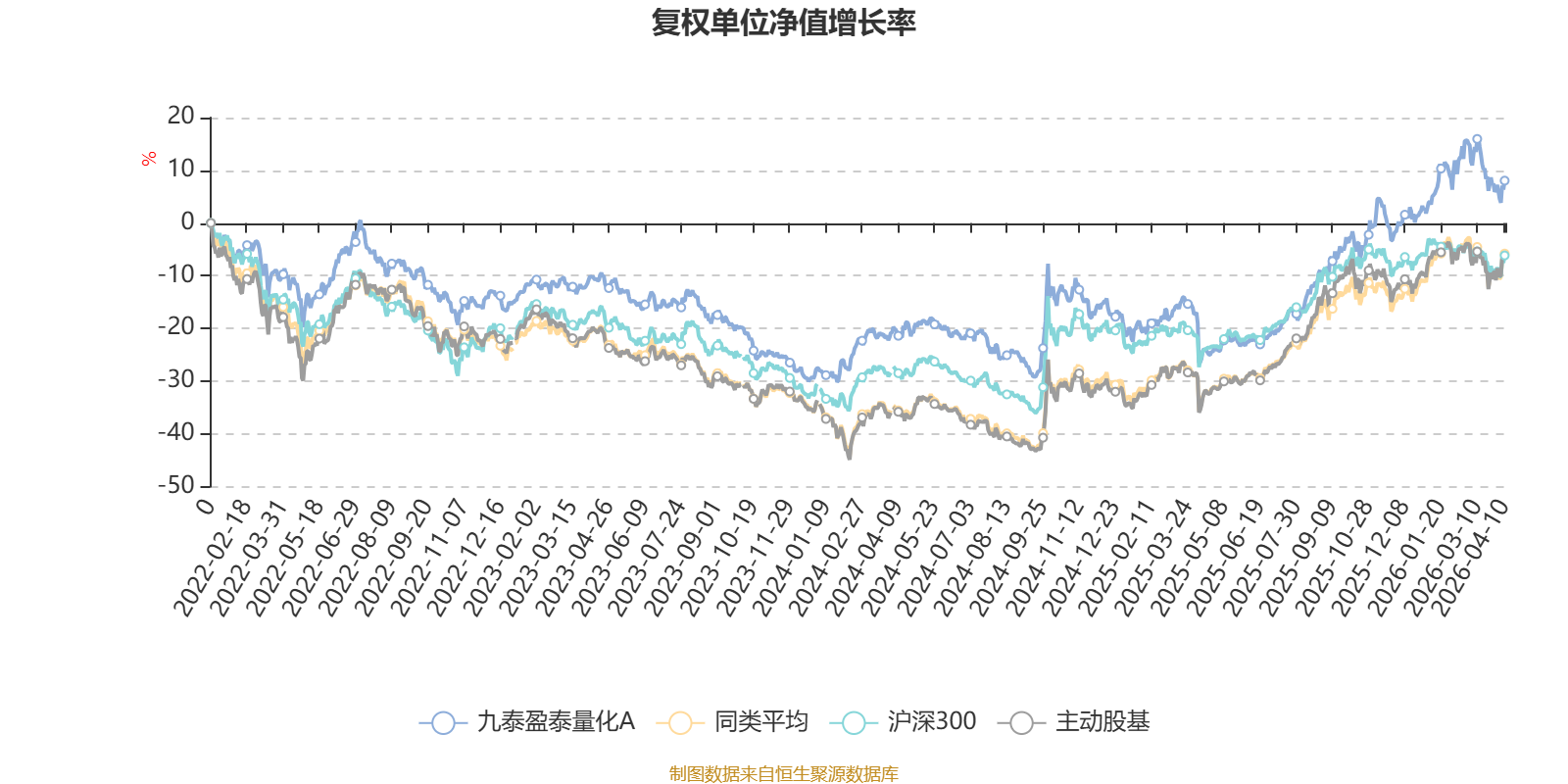 截至4月10日,九泰盈泰量化A近三个月复权单位净值增长率为2.86%,位于同类可比基金41/121;近半年复权单位净值增长率为11.23%,位于同类可比基金37/121;近一年复权单位净值增长率为42.70%,位于同类可比基金52/120;近三年复权单位净值增长率为20.67%,位于同类可比基金47/90。
