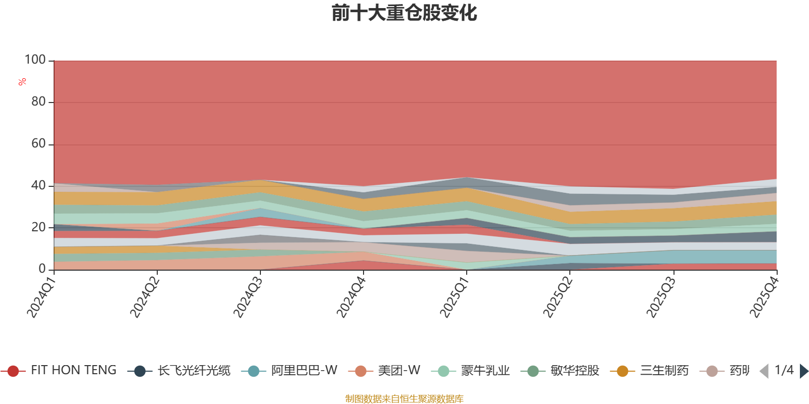 截至2025年末,基金十大重仓股分别是腾讯控股、阿里巴巴-W、中国平安、吉利汽车、香港交易所、中国生物制药、招商银行、时代电气、FIT HON TENG、泡泡玛特。