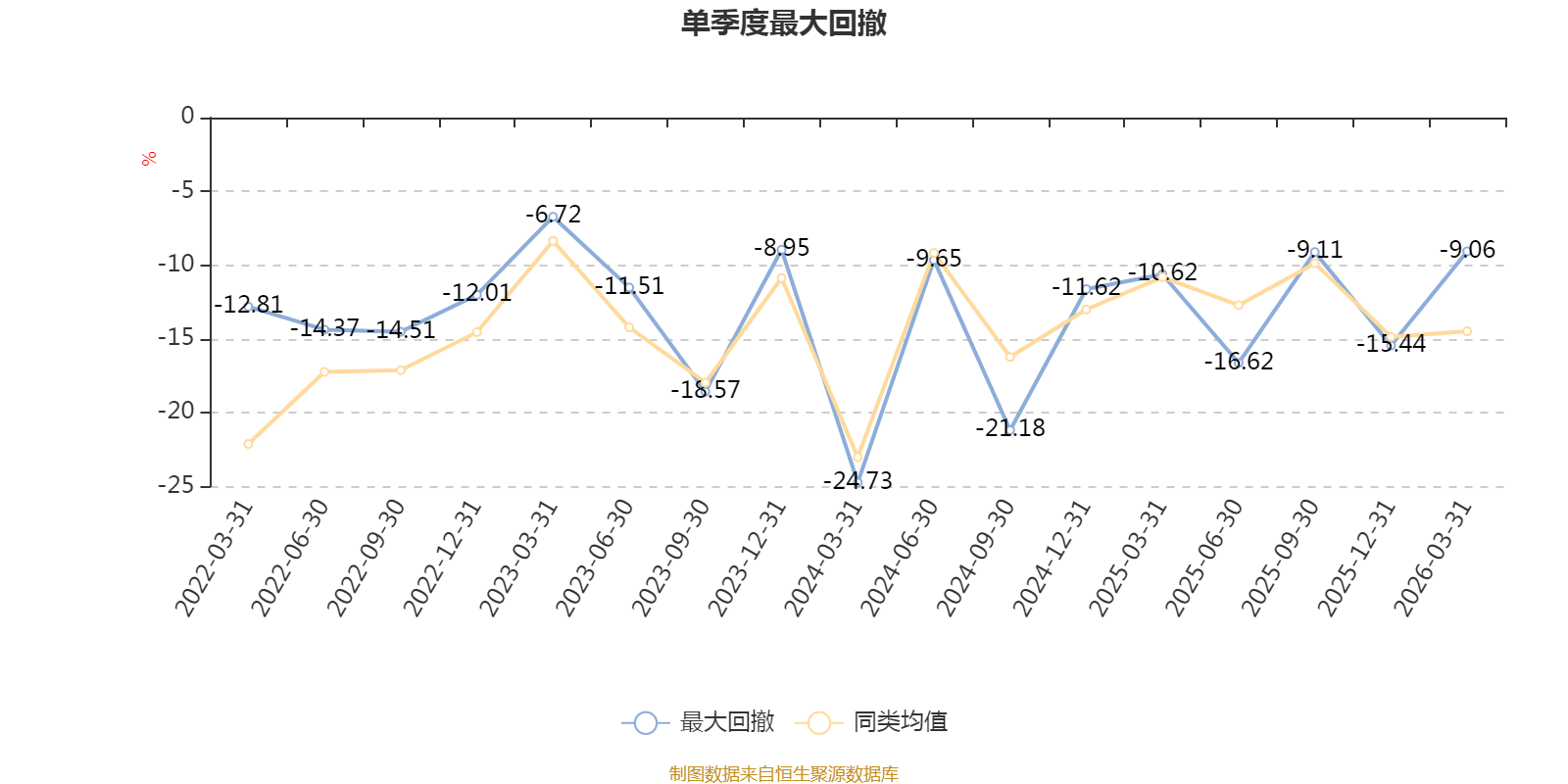 截至4月10日,基金近三年最大回撤为44.23%,同类可比基金排名107/169。单季度最大回撤出现在2024年一季度,为24.73%。