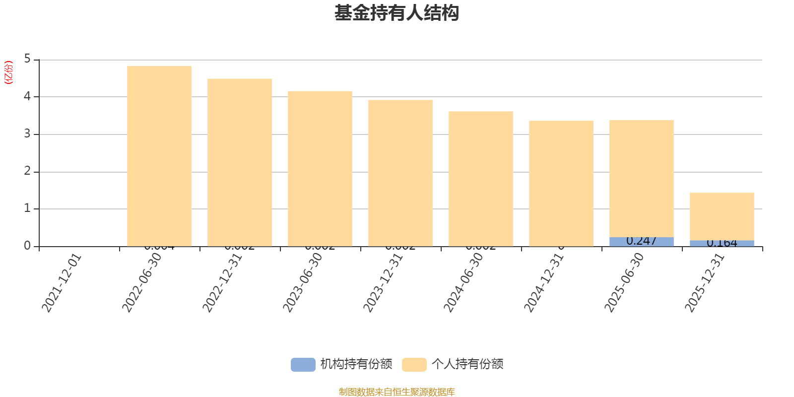 截至2025年12月31日,基金持有人共计3270户,合计持有1.44亿份。其中管理人员工持有7461.02份,占比0.01%,机构持有份额占比11.42%,个人投资者占比88.58%。