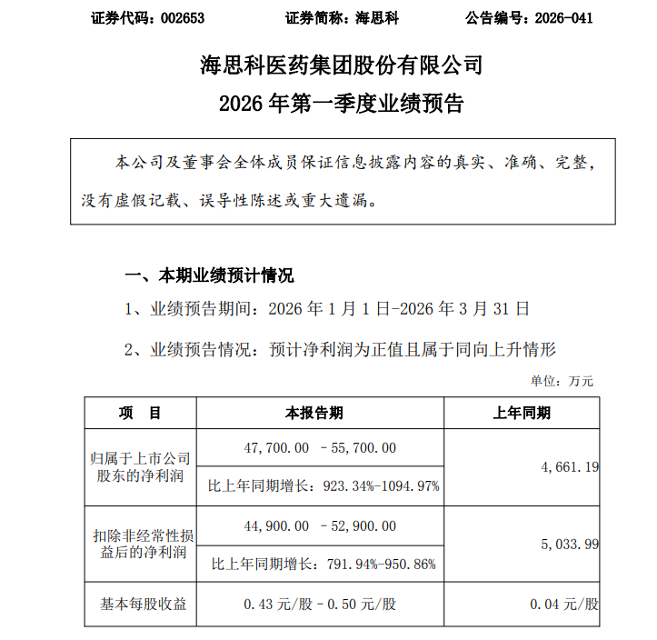 海思科(002653)4月12日晚披露2026年第一季度业绩预告,预计归属于上市公司股东的净利润4.77亿元至5.57亿元,同比增长923.34%至1094.97%;扣除非经常性损益后的净利润4.49亿元至5.29亿元,同比增长791.94%至950.86%;基本每股收益0.43元至0.50元。