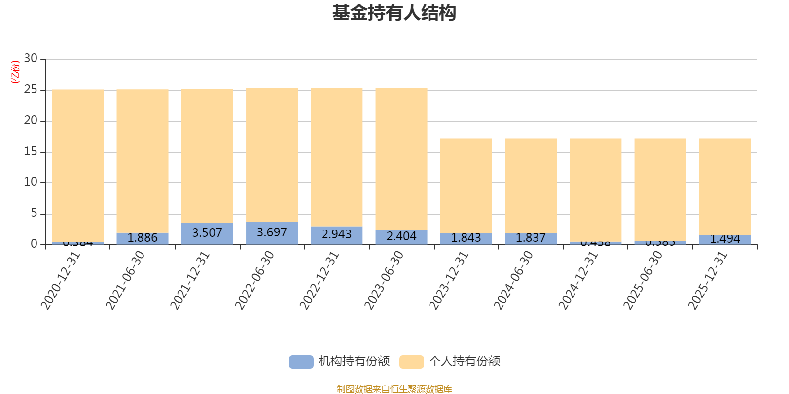 截至2025年12月31日,基金持有人共计4.43万户,合计持有17.12亿份。其中管理人员工持有186.31万份,占比0.11%,机构持有份额占比8.72%,个人投资者占比91.28%。