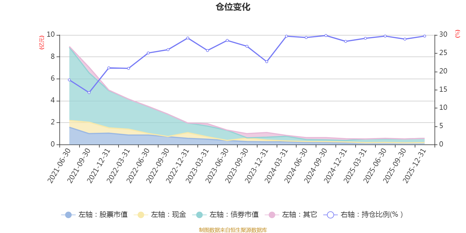 据定期报告数据统计,近三年平均股票仓位为28.19%,同类平均为19.2%。2024年三季度末基金达到29.84%的最高仓位,2021年三季度末最低,为14.23%。