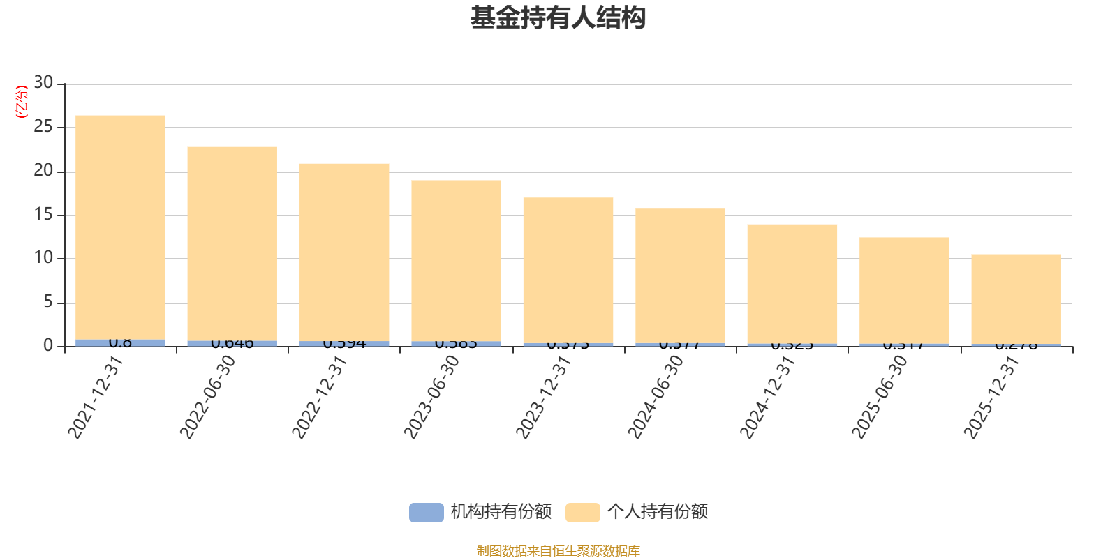 截至2025年12月31日,基金持有人共计1.1万户,合计持有10.51亿份。机构持有份额占比2.64%,个人投资者占比97.36%。