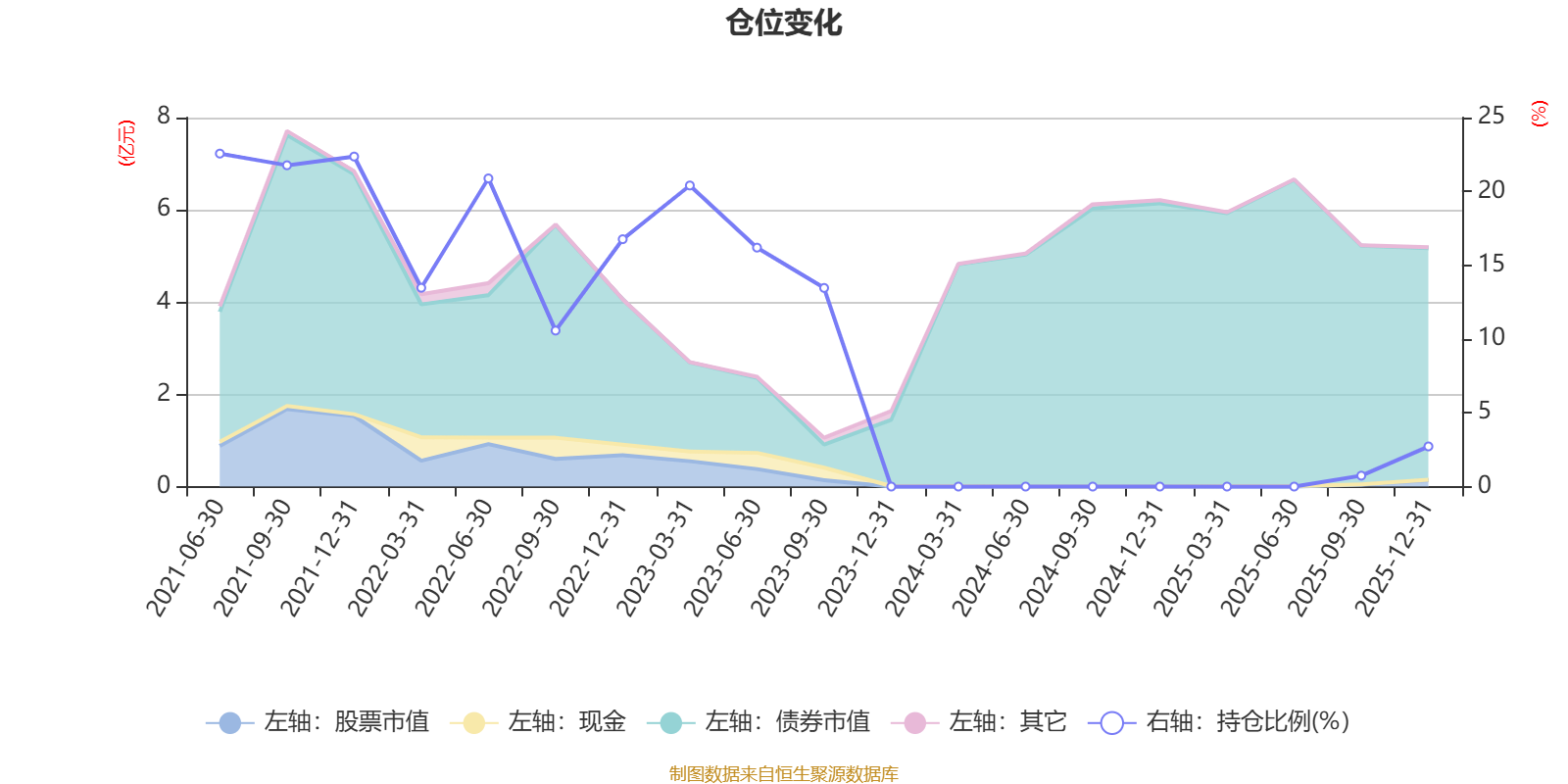 据定期报告数据统计,近三年平均股票仓位为4.46%,同类平均为19.42%。2021年上半年末基金达到22.56%的最高仓位,2025年三季度末最低,为0.74%。
