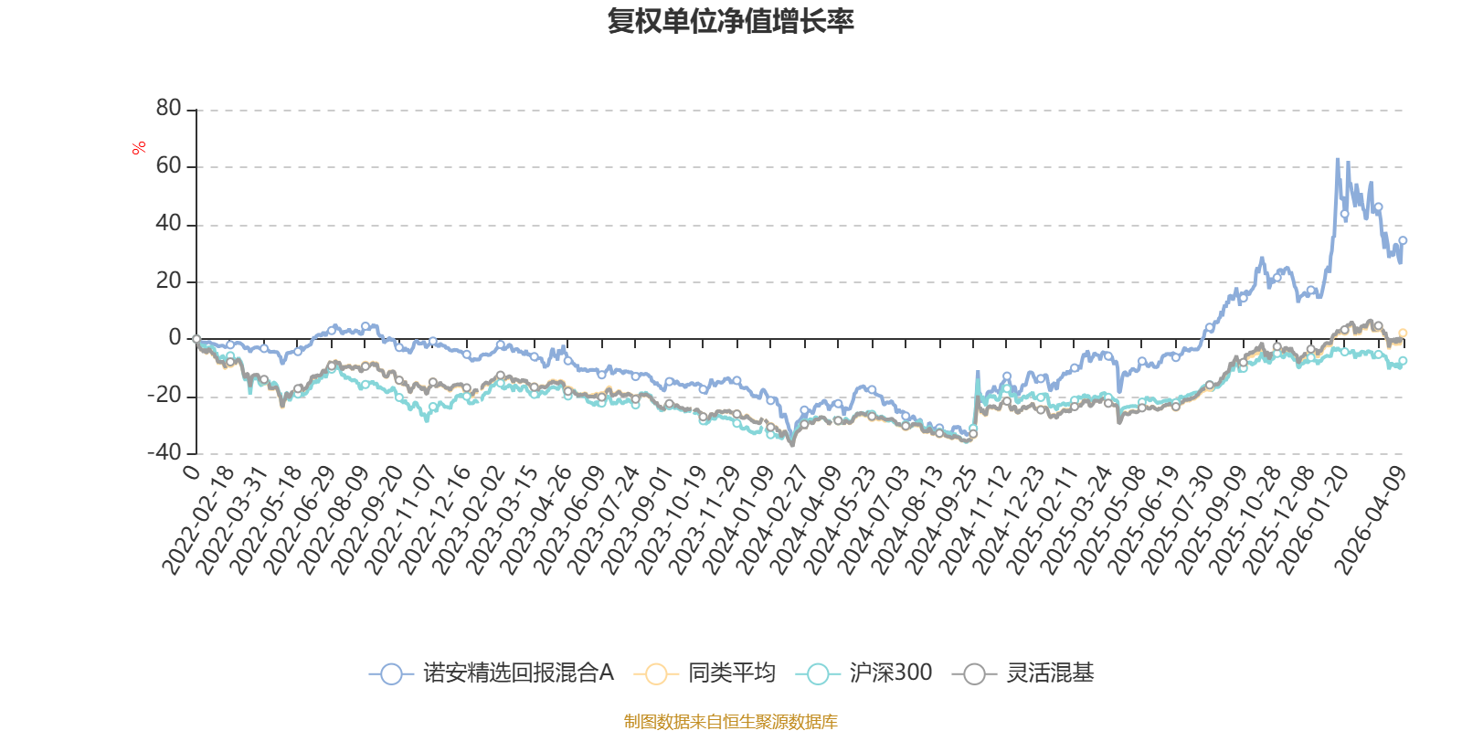 截至4月9日,诺安精选回报混合A近三个月复权单位净值增长率为-11.64%,位于同类可比基金1211/1287;近半年复权单位净值增长率为4.36%,位于同类可比基金461/1286;近一年复权单位净值增长率为60.33%,位于同类可比基金256/1286;近三年复权单位净值增长率为38.89%,位于同类可比基金228/1286。