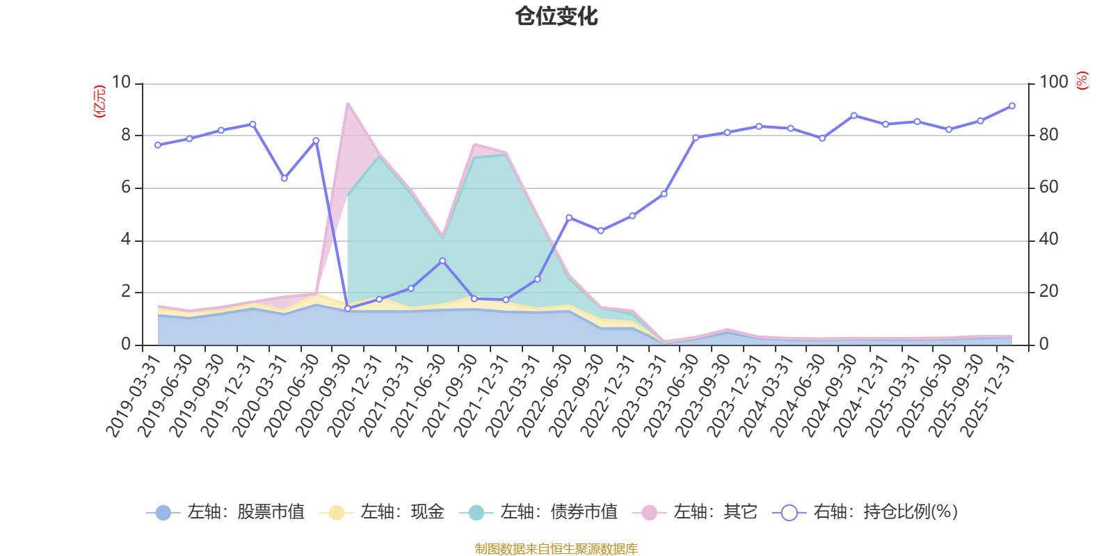 据定期报告数据统计,近三年平均股票仓位为81.74%,同类平均为72.57%。2025年末基金达到91.42%的最高仓位,2020年三季度末最低,为13.98%。