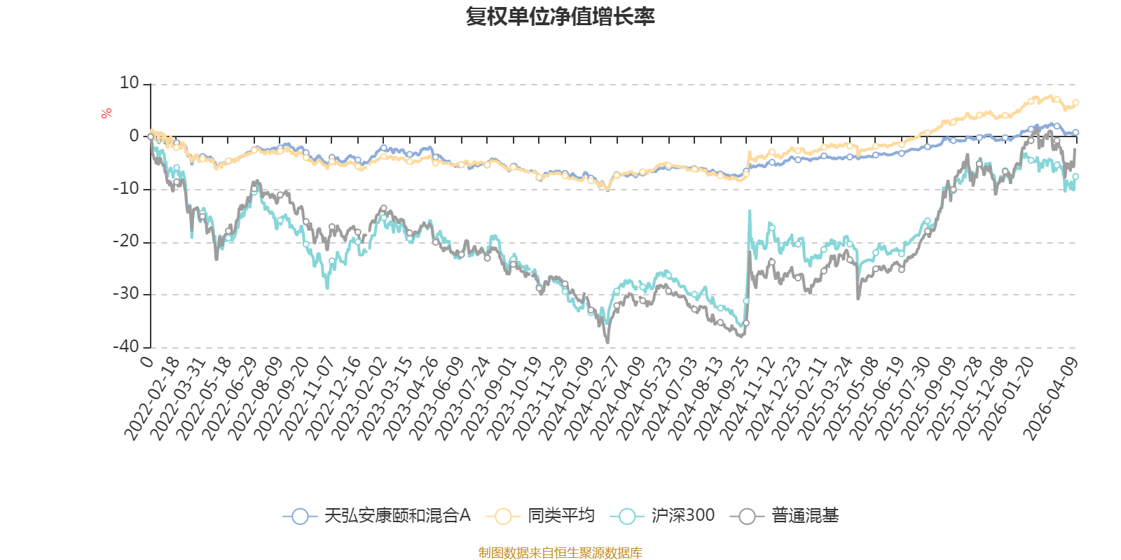 截至4月9日,天弘安康颐和混合A近三个月复权单位净值增长率为-0.26%,位于同类可比基金402/629;近半年复权单位净值增长率为0.70%,位于同类可比基金370/629;近一年复权单位净值增长率为5.00%,位于同类可比基金455/629;近三年复权单位净值增长率为2.96%,位于同类可比基金504/581。