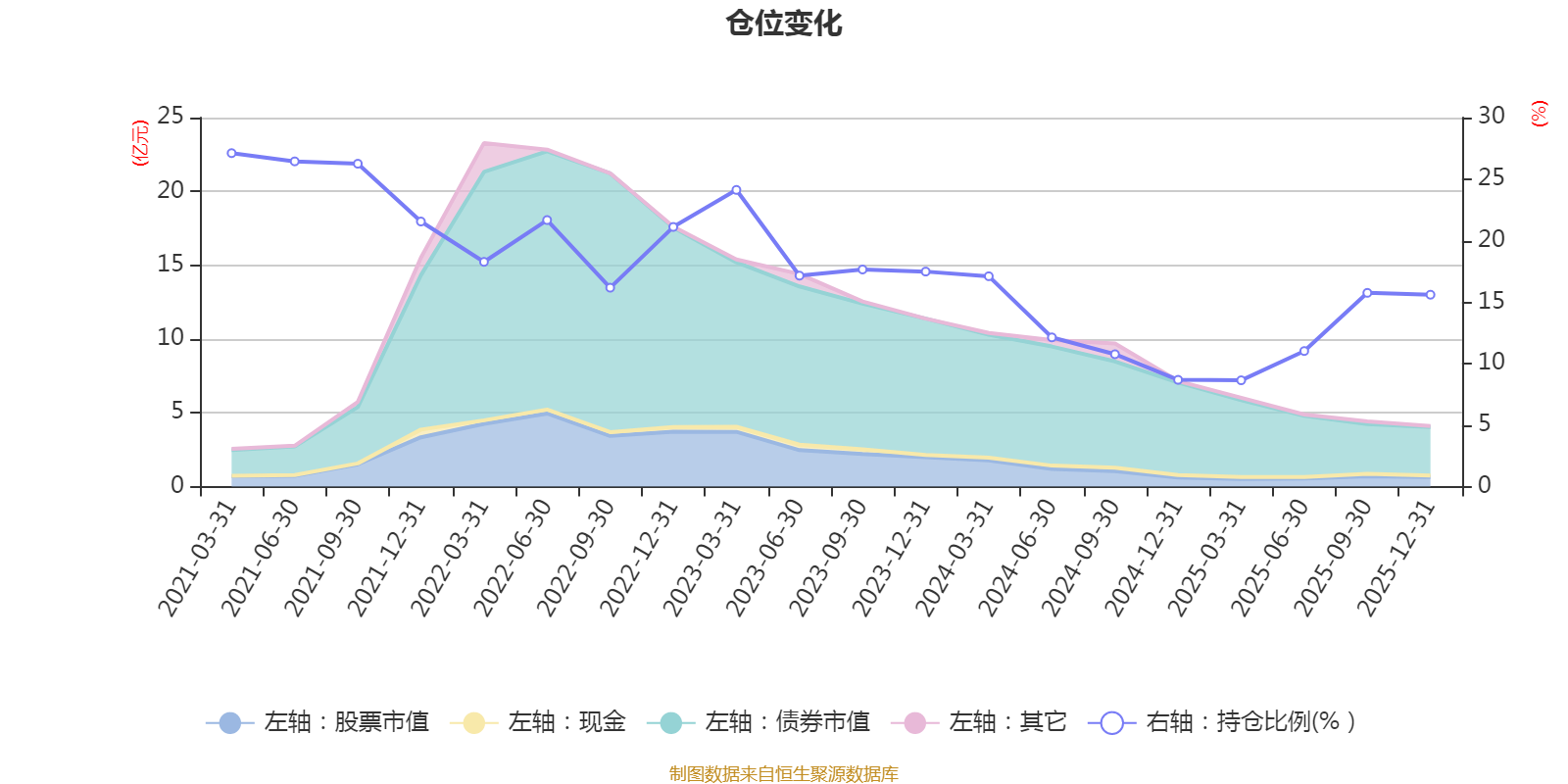 据定期报告数据统计,近三年平均股票仓位为14.67%,同类平均为19.2%。2021年一季度末基金达到27.11%的最高仓位,2025年一季度末最低,为8.64%。