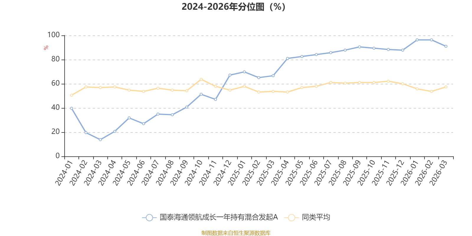 通过所选区间该基金净值增长率分位图,可以观察该基金与同类基金业绩比较情况。图为坐标原点到区间内某时点的净值增长率在同类基金中的分位数。
