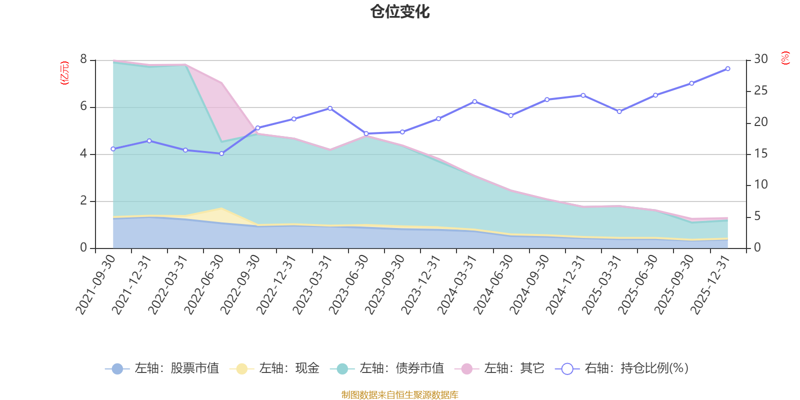 据定期报告数据统计,近三年平均股票仓位为22.79%,同类平均为19.2%。2025年末基金达到28.62%的最高仓位,2022年上半年末最低,为15.09%。