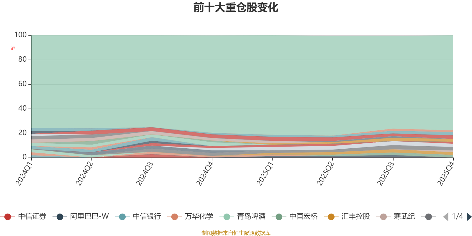 截至2025年末,基金十大重仓股分别是招商银行、宁德时代、小米集团-W、紫金矿业、腾讯控股、中国宏桥、汇丰控股、中国平安、寒武纪、中芯国际。