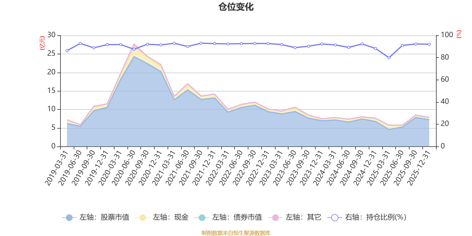 据定期报告数据统计,近三年平均股票仓位为89.96%,同类平均为86.9%。2021年三季度末基金达到93%的最高仓位,2025年一季度末最低,为79.88%。