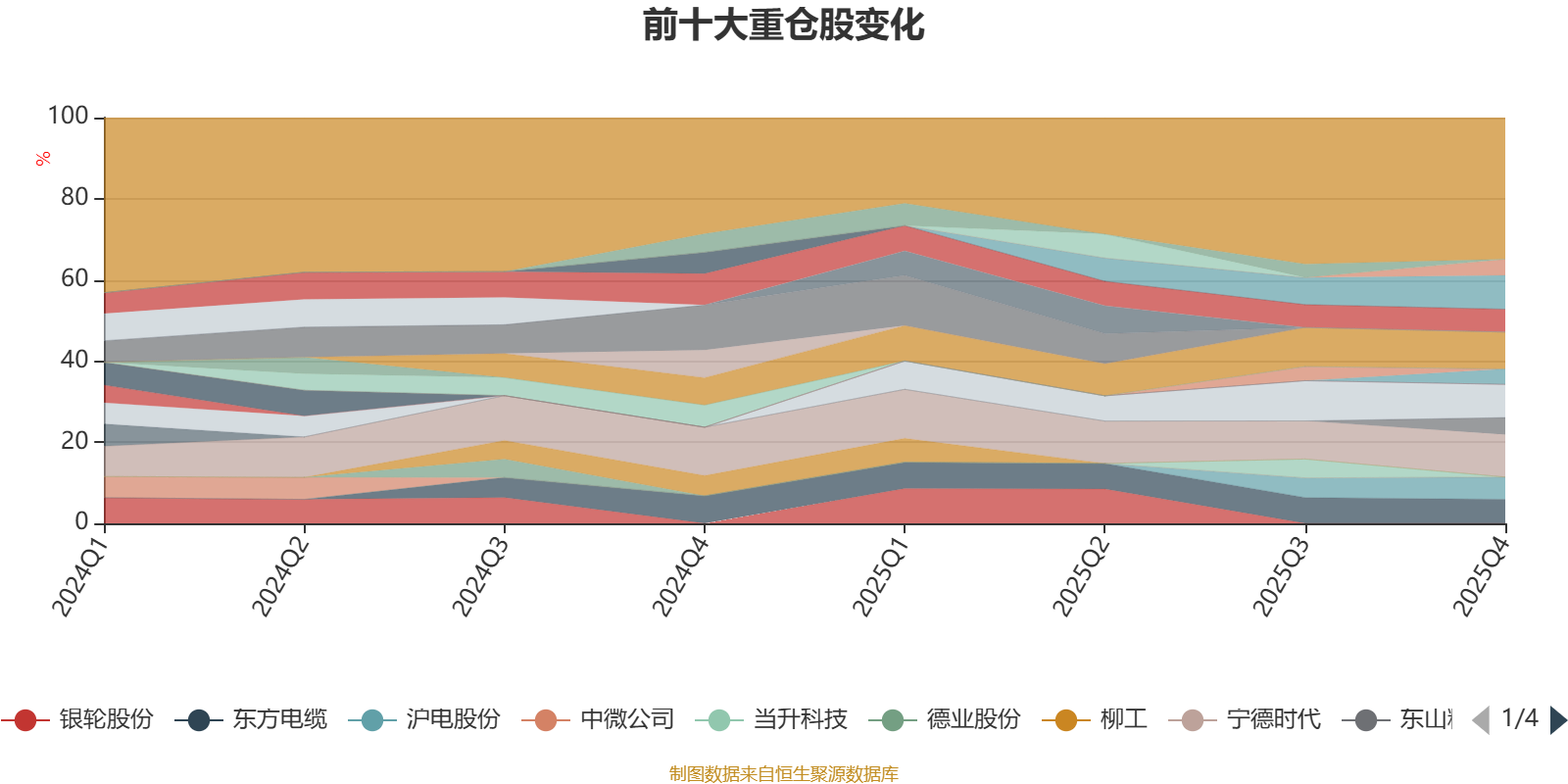 该基金持股集中度较高。截至2025年末,基金十大重仓股分别是宁德时代、科达利、大金重工、亿纬锂能、东方电缆、立讯精密、沪电股份、东山精密、中际旭创、海博思创。