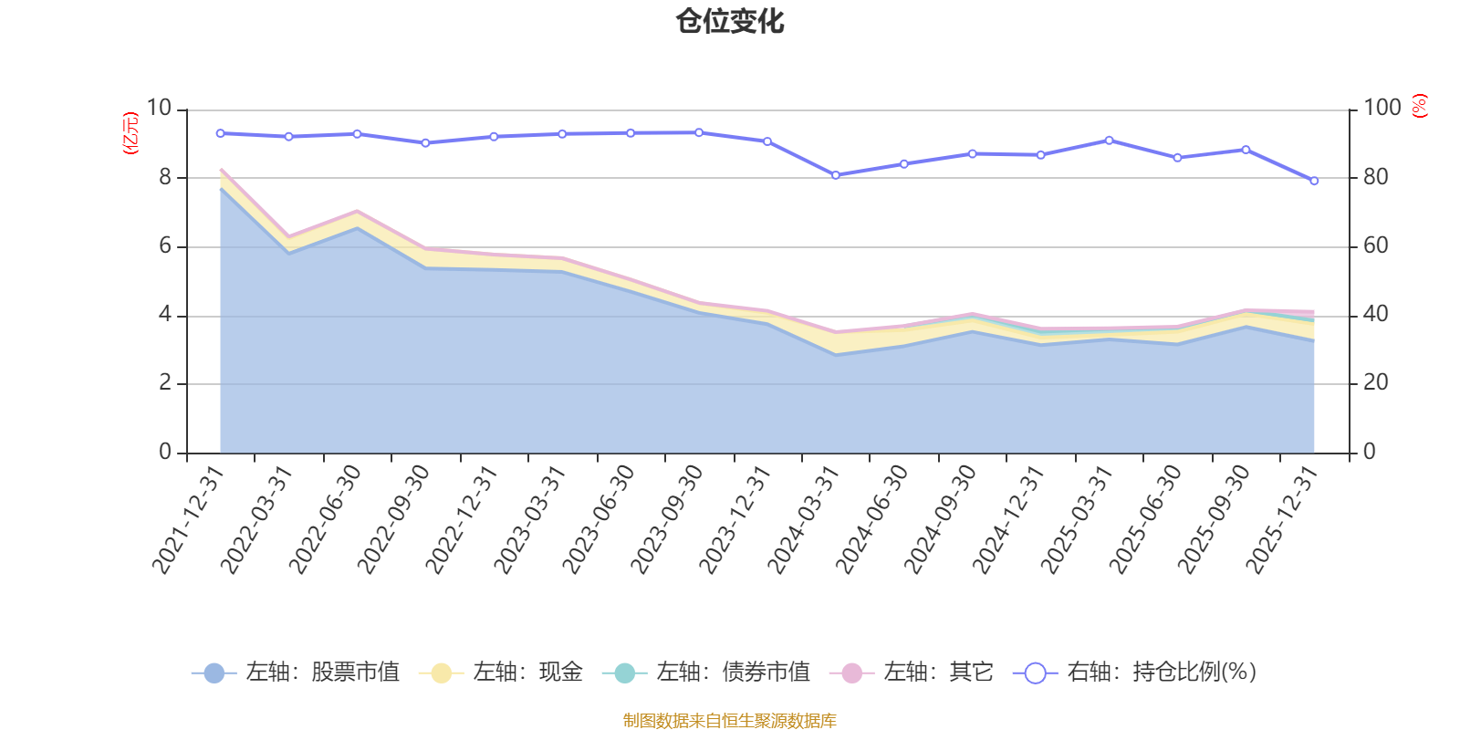 据定期报告数据统计,近三年平均股票仓位为87.78%,同类平均为85.83%。2023年三季度末基金达到93.3%的最高仓位,2025年末最低,为79.24%。
