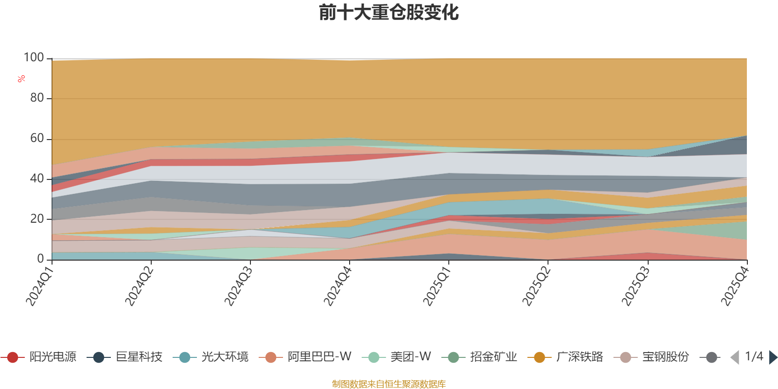 截至2025年末,基金十大重仓股分别是中通快递-W、阿里巴巴-W、山东黄金、招金矿业、新钢股份、长江电力、新城发展、广深铁路、川投能源、龙源电力。