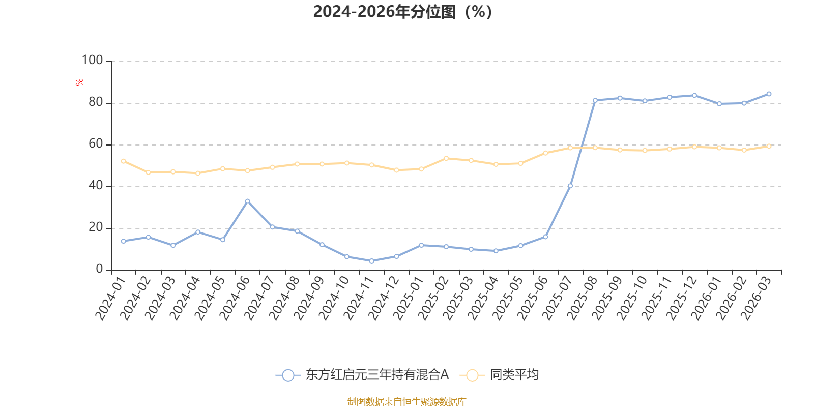 通过所选区间该基金净值增长率分位图,可以观察该基金与同类基金业绩比较情况。图为坐标原点到区间内某时点的净值增长率在同类基金中的分位数。