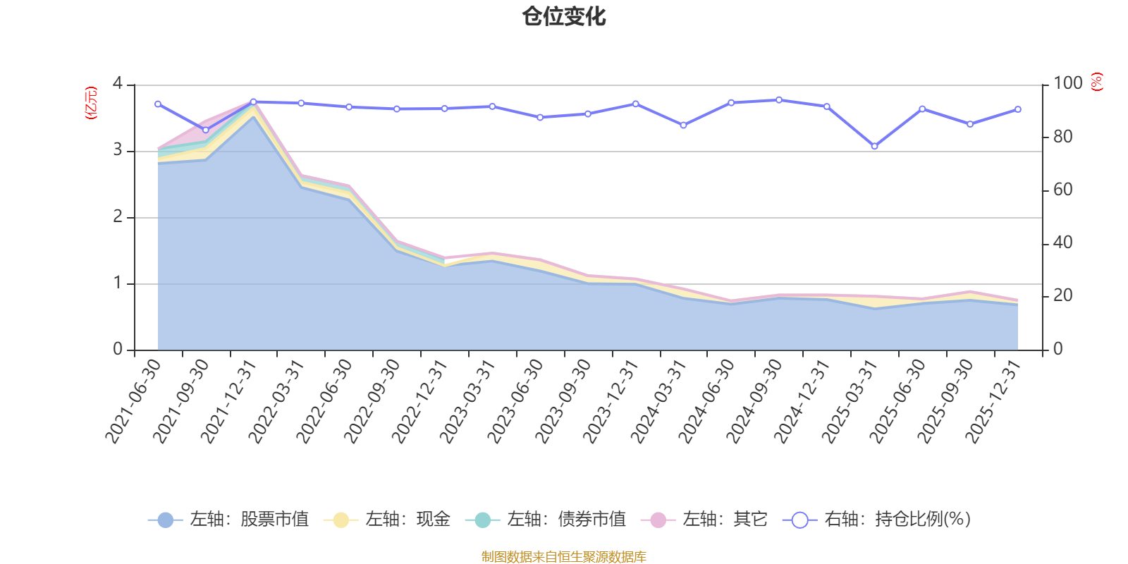 据定期报告数据统计,近三年平均股票仓位为89.04%,同类平均为86.9%。2024年三季度末基金达到94.25%的最高仓位,2025年一季度末最低,为76.8%。