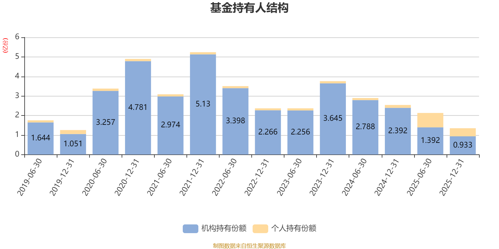 截至2025年12月31日,基金持有人共计4045户,合计持有1.35亿份。其中管理人员工持有14.57万份,占比0.11%,机构持有份额占比69.24%,个人投资者占比30.76%。