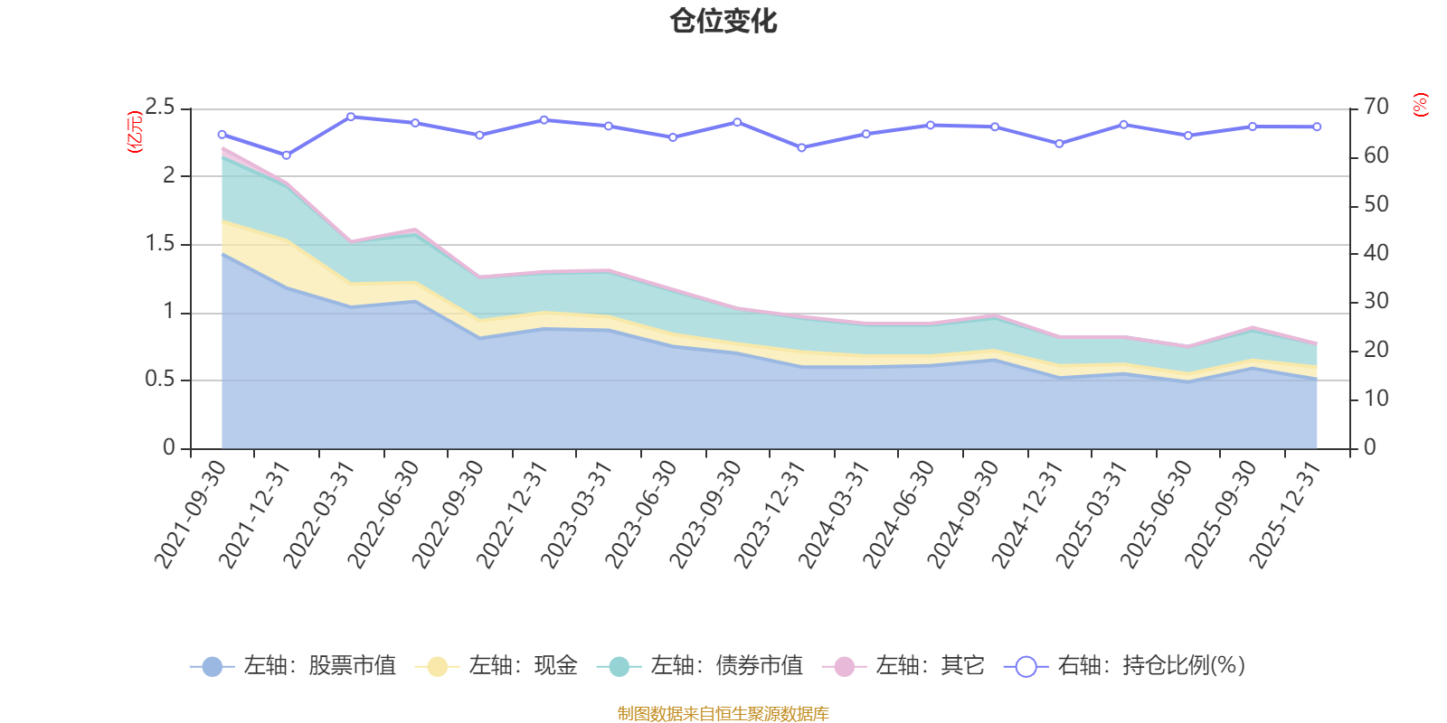 据定期报告数据统计,近三年平均股票仓位为65.29%,同类平均为67.52%。2022年一季度末基金达到68.3%的最高仓位,2021年末最低,为60.38%。