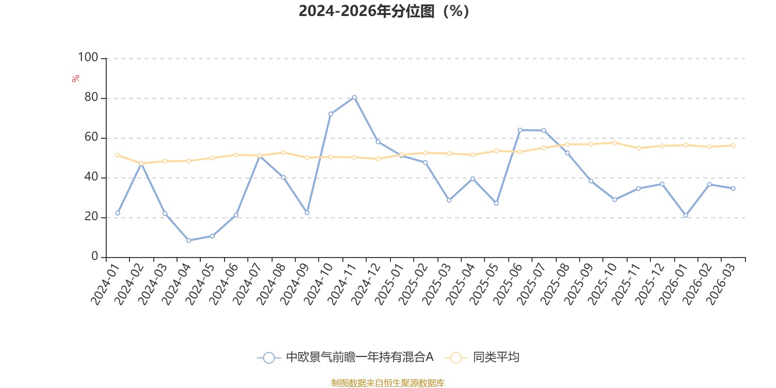 通过所选区间该基金净值增长率分位图,可以观察该基金与同类基金业绩比较情况。图为坐标原点到区间内某时点的净值增长率在同类基金中的分位数。