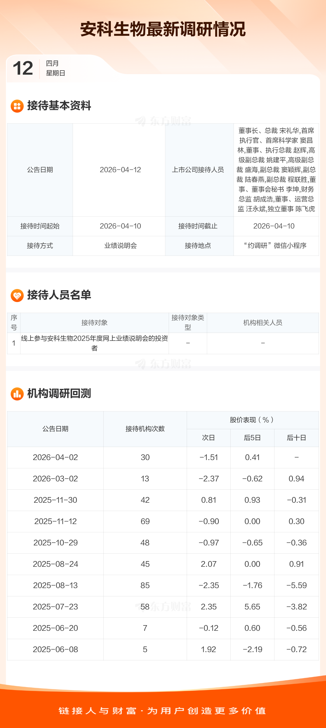 安科生物4月12日公告称,4月10日接待线上参与安科生物2025年度网上业绩说明会的投资者等1家机构调研。接待人员包括董事长、总裁 宋礼华,首席执行官、首席科学家 窦昌林,董事、执行总裁 赵辉,高级副总裁 姚建平,高级副总裁 盛海,副总裁 窦颖辉,副总裁 陆春燕,副总裁 程联胜,董事、董事会秘书 李坤,财务总监 胡成浩,董事、运营总监 汪永斌,独立董事 陈飞虎。