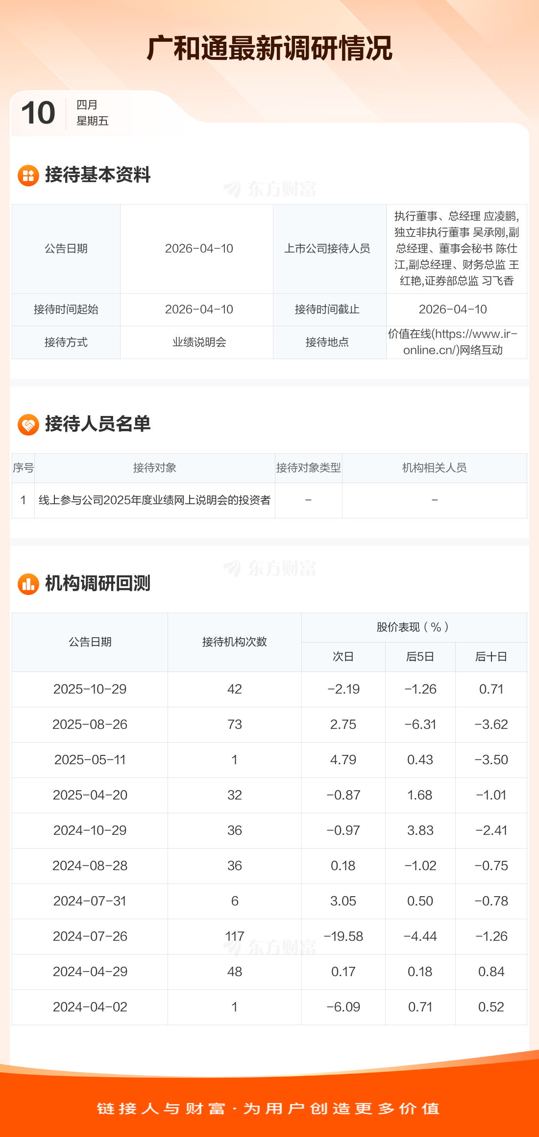 广和通4月10日公告称,4月10日接待线上参与公司2025年度业绩网上说明会的投资者等1家机构调研。接待人员包括执行董事、总经理 应凌鹏,独立非执行董事 吴承刚,副总经理、董事会秘书 陈仕江,副总经理、财务总监 王红艳,证券部总监 习飞香。