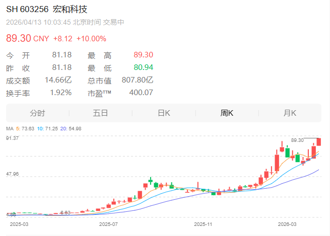 热点方面,宏和科技10%涨停,股价再创历史新高,最新市值808亿元。宏和科技2025年实现归属于上市公司股东的净利润为2.02亿元,同比增长785.55%。宏和科技是2025年资本市场“大牛股”之一,2025年4月9日,公司股价触及波段最低,随后开启新一波上涨,2026年2月26日达到85.83元/股的历史高位,波段期间涨幅达到1000%。
