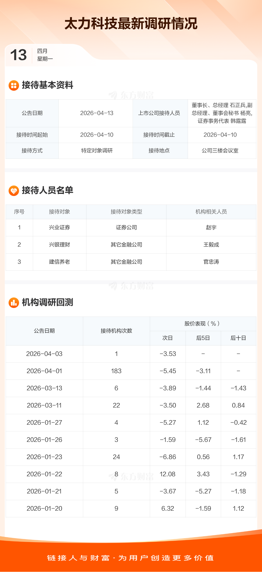太力科技4月13日公告称,4月10日接待兴业证券等3家机构调研。接待人员包括董事长、总经理 石正兵,副总经理、董事会秘书 杨亮,证券事务代表 韩露露。