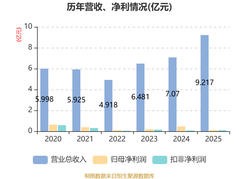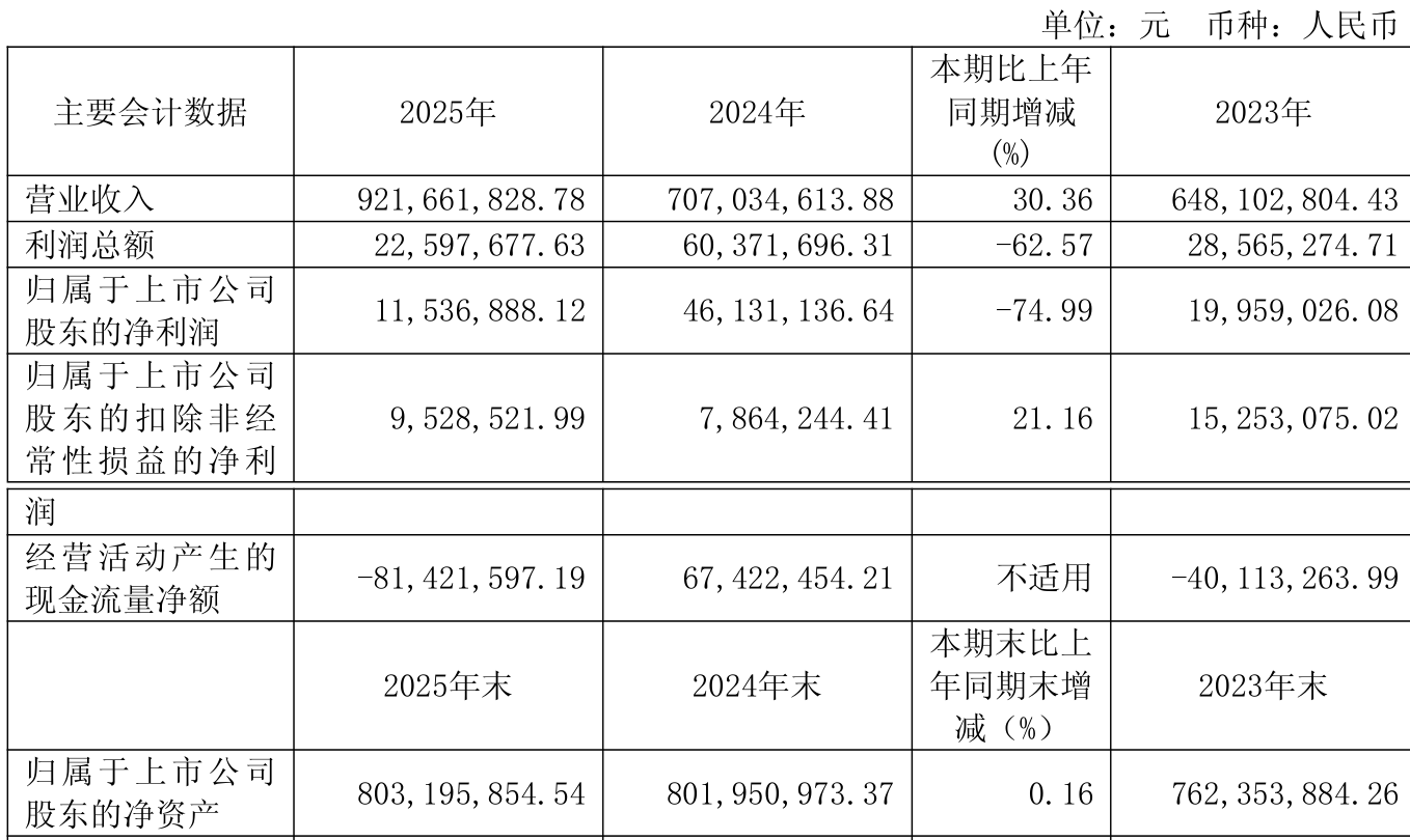 中证智能财讯德宏股份(603701)4月13日披露2025年年度报告。2025年,公司实现营业总收入9.22亿元,同比增长30.36%;归母净利润1153.69万元,同比下降74.99%;扣非净利润952.85万元,同比增长21.16%;经营活动产生的现金流量净额为-8142.16万元,上年同期为6742.25万元;报告期内,德宏股份基本每股收益为0.04元,加权平均净资产收益率为1.44%。公司2025年度分配预案为:拟向全体股东每10股派现0.4元(含税)。