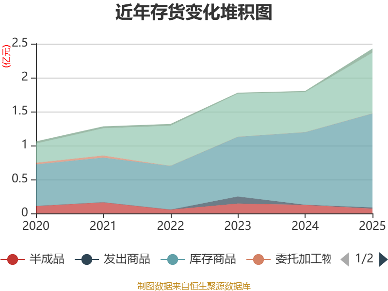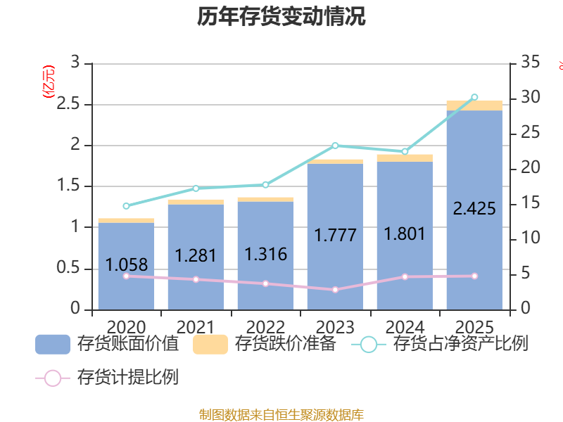 从存货变动来看,截至2025年末,公司存货账面价值为2.42亿元,占净资产的30.19%,较上年末增加6240.82万元。其中,存货跌价准备为1208.96万元,计提比例为4.75%。