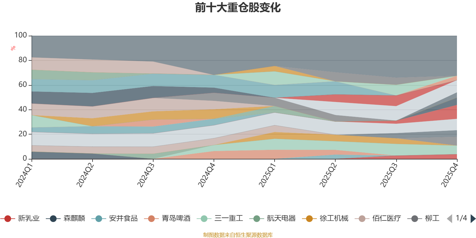 该基金持股集中度较高,近2年前十大重仓股集中度长期超过60%。截至2025年末,基金十大重仓股分别是九号公司、牧原股份、宁德时代、柳工、三一重工、中国海油、嘉友国际、宏华数科、新乳业、奕瑞科技。