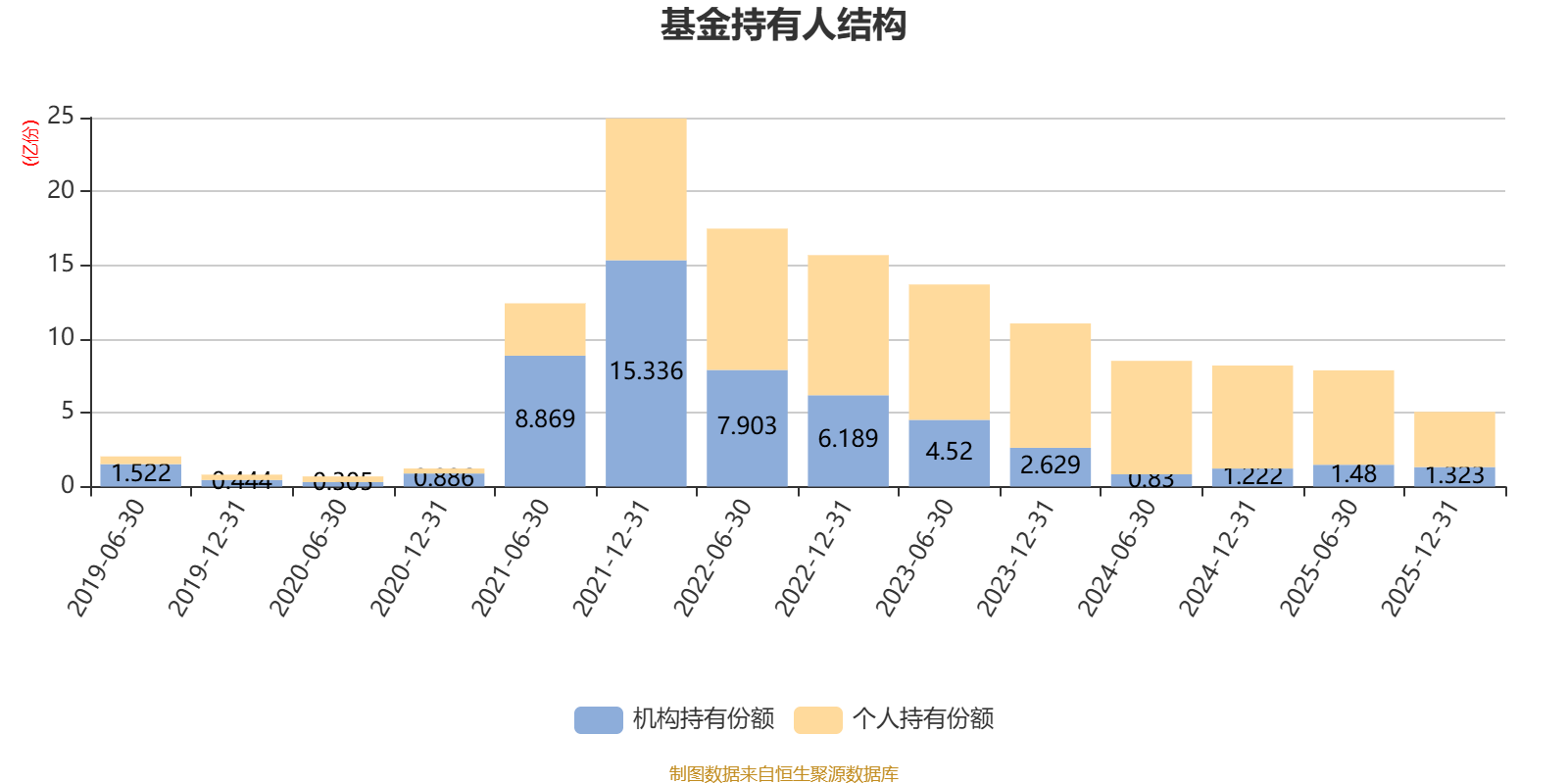 截至2025年12月31日,基金持有人共计7.99万户,合计持有5.06亿份。其中管理人员工持有194.21万份,占比0.38%,机构持有份额占比26.12%,个人投资者占比73.88%。