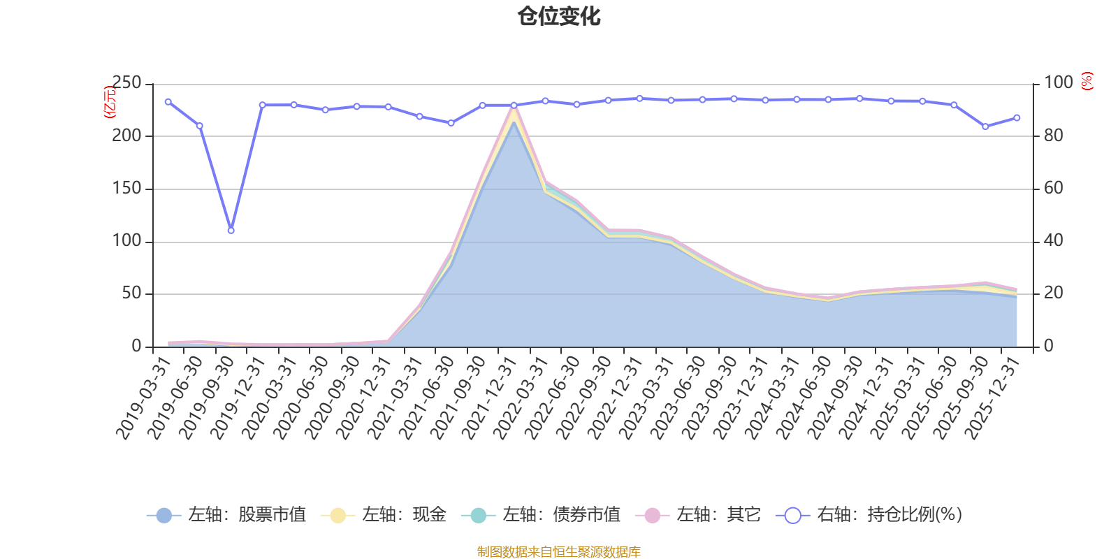 据定期报告数据统计,近三年平均股票仓位为92.35%,同类平均为72.57%。2022年末基金达到94.46%的最高仓位,2019年三季度末最低,为44.25%。