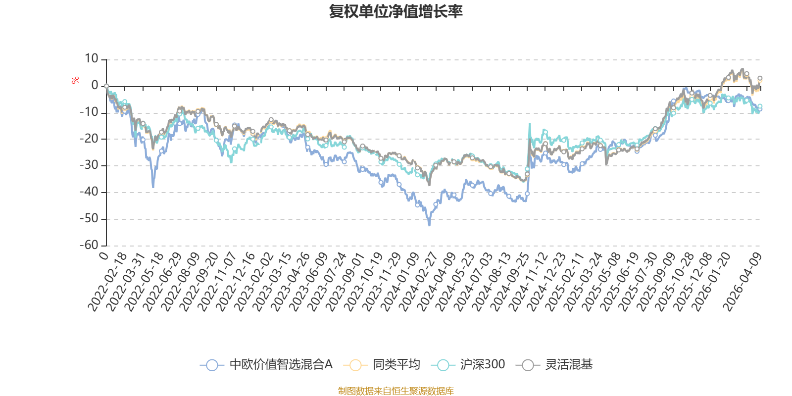 该基金属于灵活配置型基金。截至4月9日,单位净值为5.138元。基金经理是袁维德,目前管理的4只基金近一年均为正收益。其中,截至4月9日,中欧多元价值三年持有混合A近一年复权单位净值增长率最高,达23.87%;截至4月3日,中欧睿泓定期开放混合最低,为18.66%。