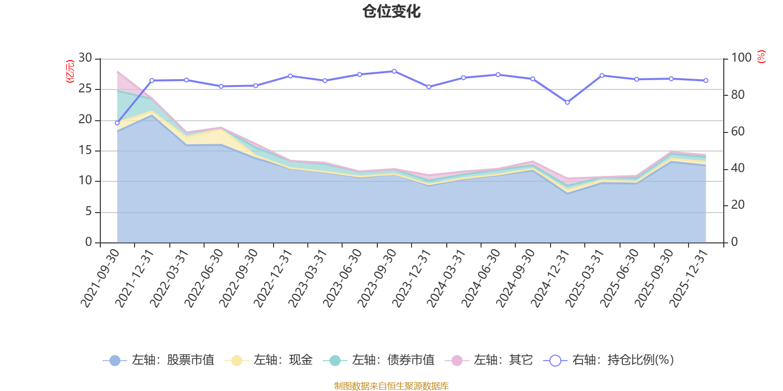据定期报告数据统计,近三年平均股票仓位为88.36%,同类平均为72.57%。2023年三季度末基金达到93.15%的最高仓位,2021年三季度末最低,为65.08%。