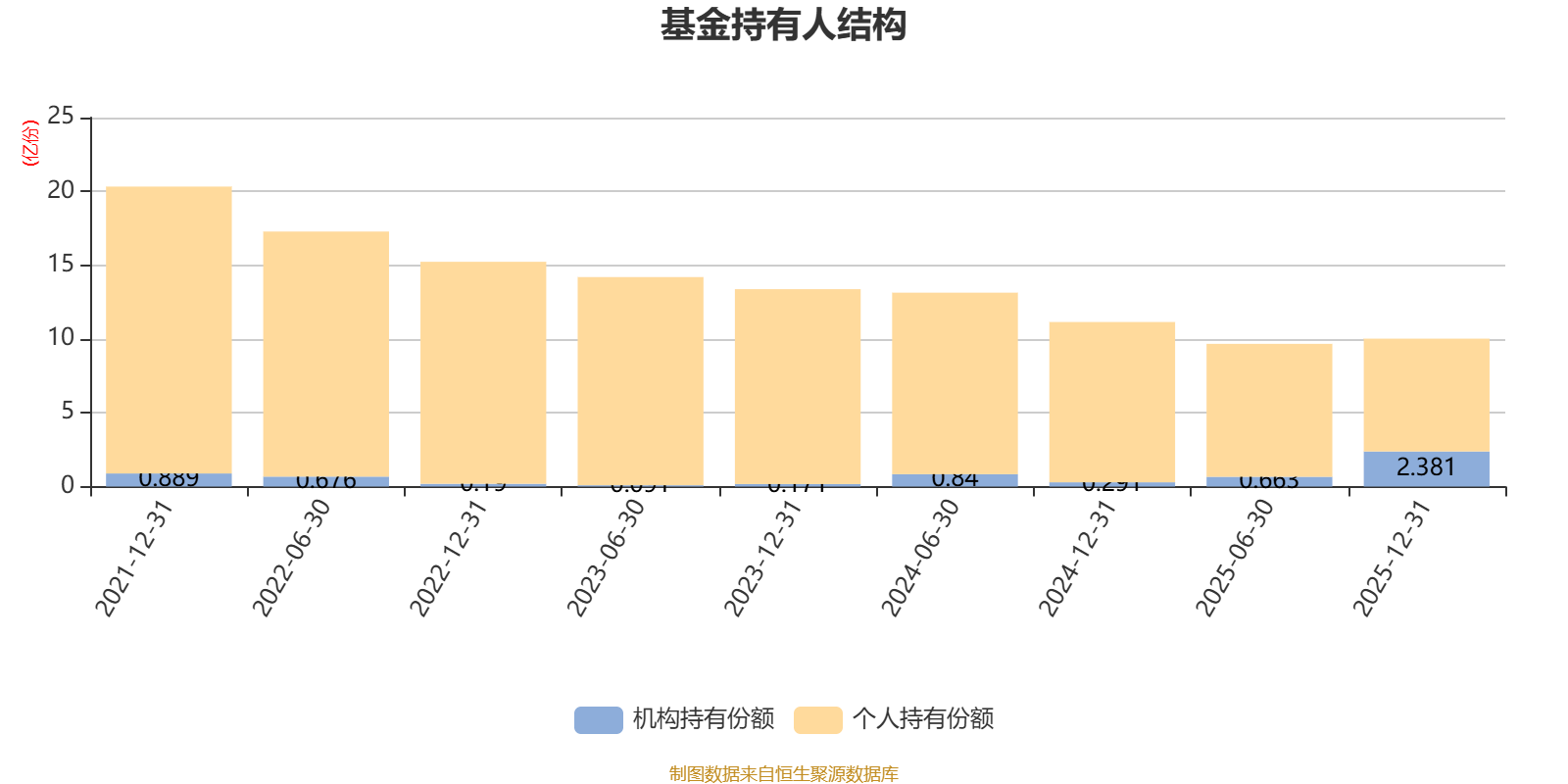 截至2025年12月31日,基金持有人共计8.73万户,合计持有10.02亿份。其中管理人员工持有315.82万份,占比0.32%,机构持有份额占比23.76%,个人投资者占比76.24%。