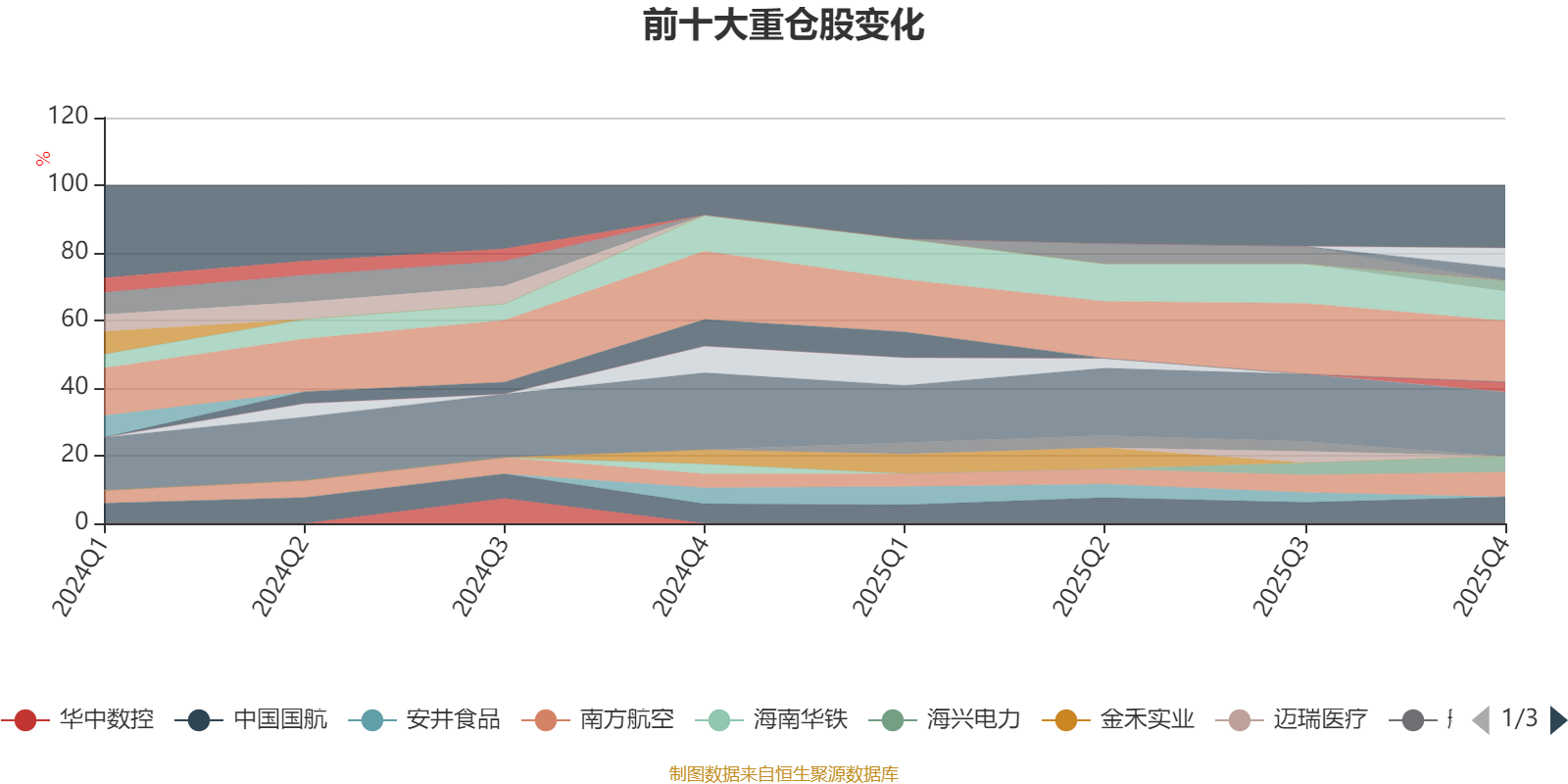 该基金持股集中度较高,近2年前十大重仓股集中度长期超过60%。截至2025年末,基金十大重仓股分别是赛轮轮胎、国联股份、鸿路钢构、中国国航、南方航空、新和成、海兴电力、顺丰控股、京东方A、史丹利。