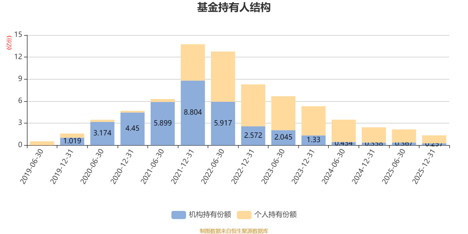截至2025年12月31日,基金持有人共计5.77万户,合计持有1.35亿份。其中管理人员工持有6.02万份,占比0.04%,机构持有份额占比19.10%,个人投资者占比80.90%。