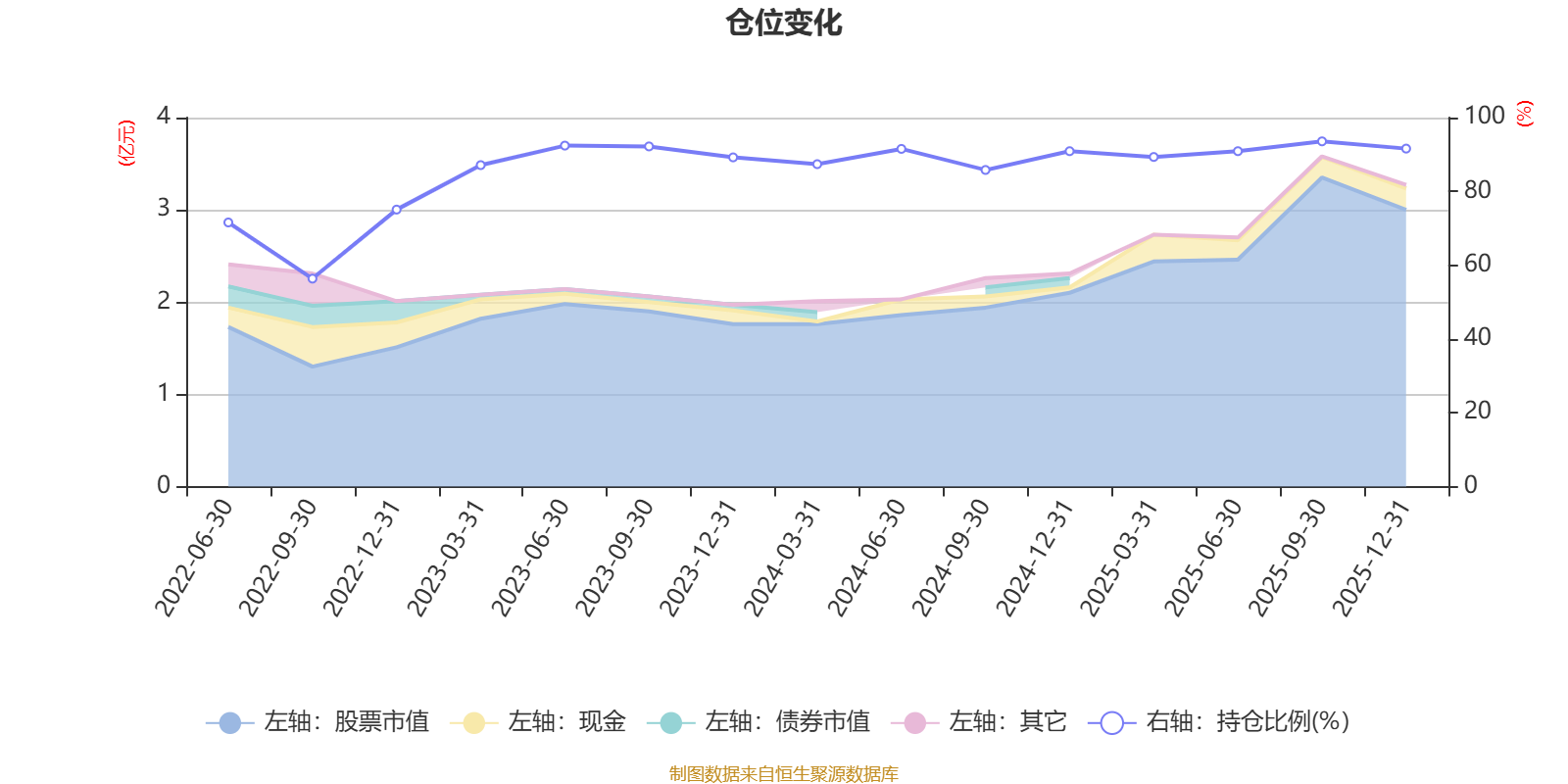 据定期报告数据统计,近三年平均股票仓位为90.16%,同类平均为85.83%。2025年三季度末基金达到93.56%的最高仓位,2022年三季度末最低,为56.36%。