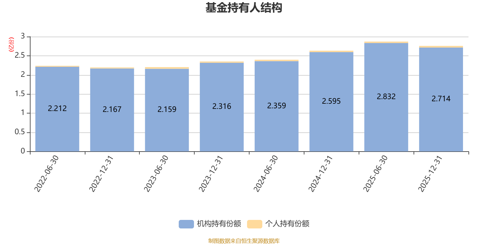 截至2025年12月31日,基金持有人共计304户,合计持有2.76亿份。其中管理人员工持有90.11万份,占比0.33%,机构持有份额占比98.43%,个人投资者占比1.57%。