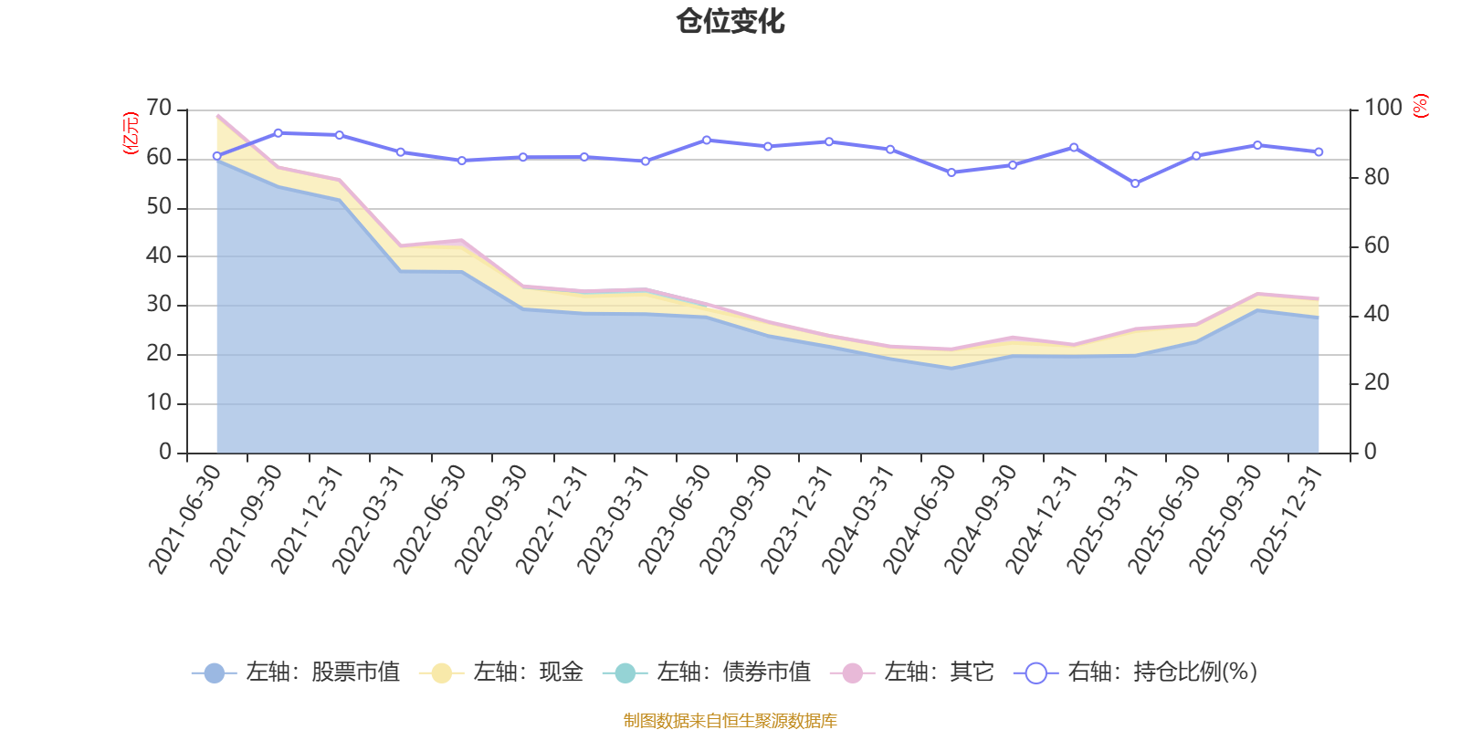 据定期报告数据统计,近三年平均股票仓位为86.76%,同类平均为86.17%。2021年三季度末基金达到93.15%的最高仓位,2025年一季度末最低,为78.49%。