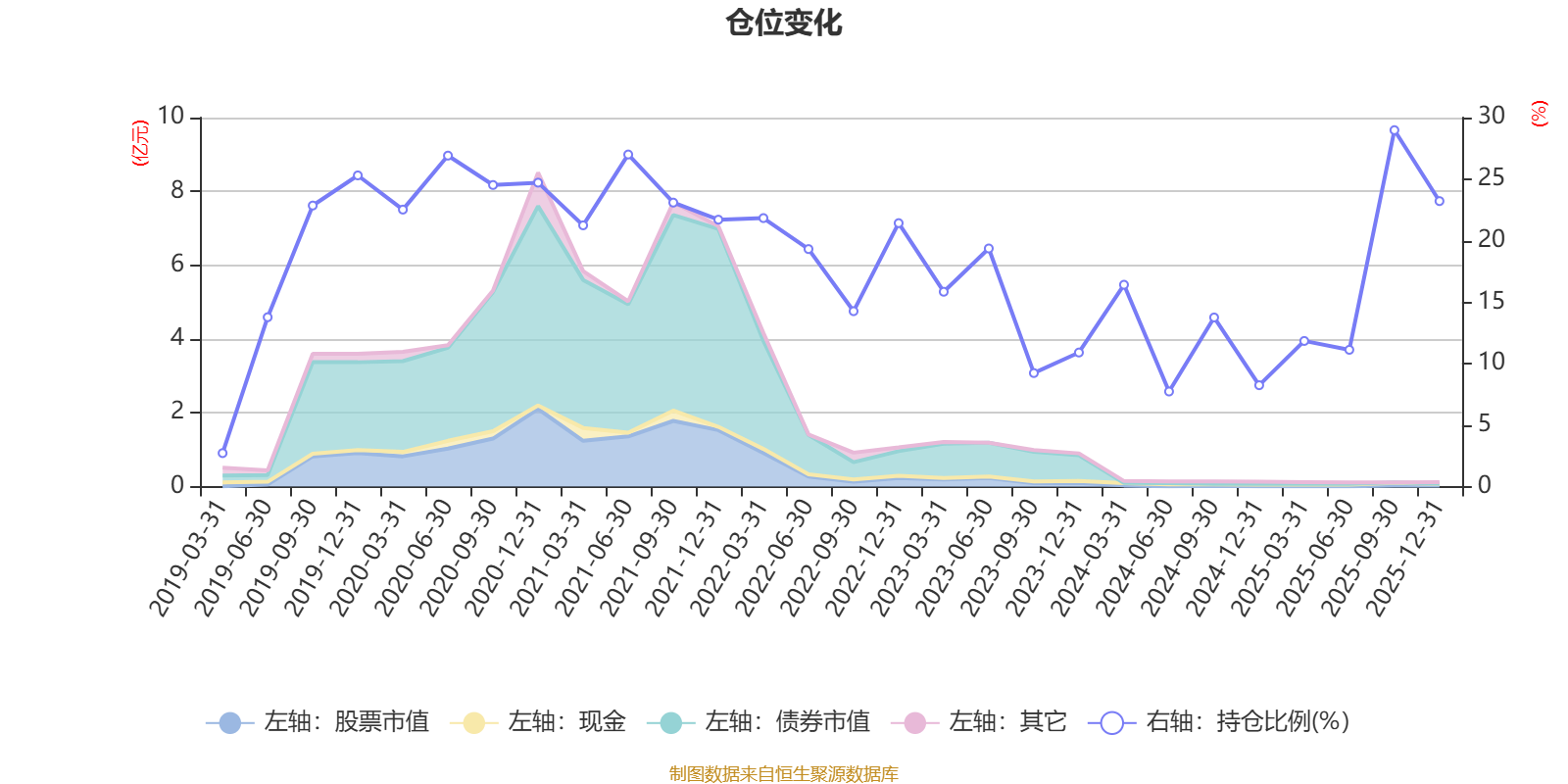据定期报告数据统计,近三年平均股票仓位为14.72%,同类平均为72.57%。2025年三季度末基金达到28.98%的最高仓位,2019年一季度末最低,为2.72%。